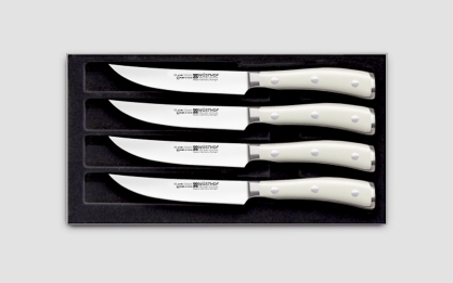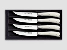 The Ikon line contains three collections of cutting objects: Ikon, Classic Ikon and Ikon Cream White, which differ in color and handle material. In the Ikon series, the handles of the knives are made of the African Eben wood, and in the Classic Ikon collection, the handles are black of synthetic material; Ikon Cream White knives have synthetic cream handles on riveting. This collection contains more than 20 different cutting tools, suitable for any kind of culinary work. Blades of the Ikon series belong to the highest price category of Wusthof products.