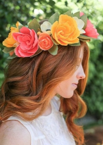 Felt is a thin dense felt, which is made of wool, sometimes with the addition of synthetics. This material is ideal for creating jewelry. From it you can make a variety of flowers - chamomile, roses, peonies, orchids. Ready-made wreaths with such colors look very beautiful, they are especially well combined with woolen dresses, sweaters and other knitted clothes.