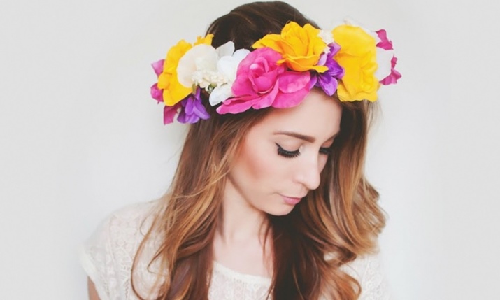 The colors of the flowers on the rims are varied, there are accessories for every taste. If you want to create a spectacular catchy image, choose a bold combination of white and red, pink with blue, yellow with green, crimson with blue. For such a bright accessory it is worth picking up clothes from a more restrained palette. It is better if it will be two colors that are present in the color scheme of your wreath.