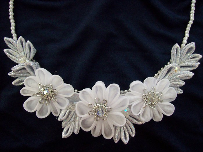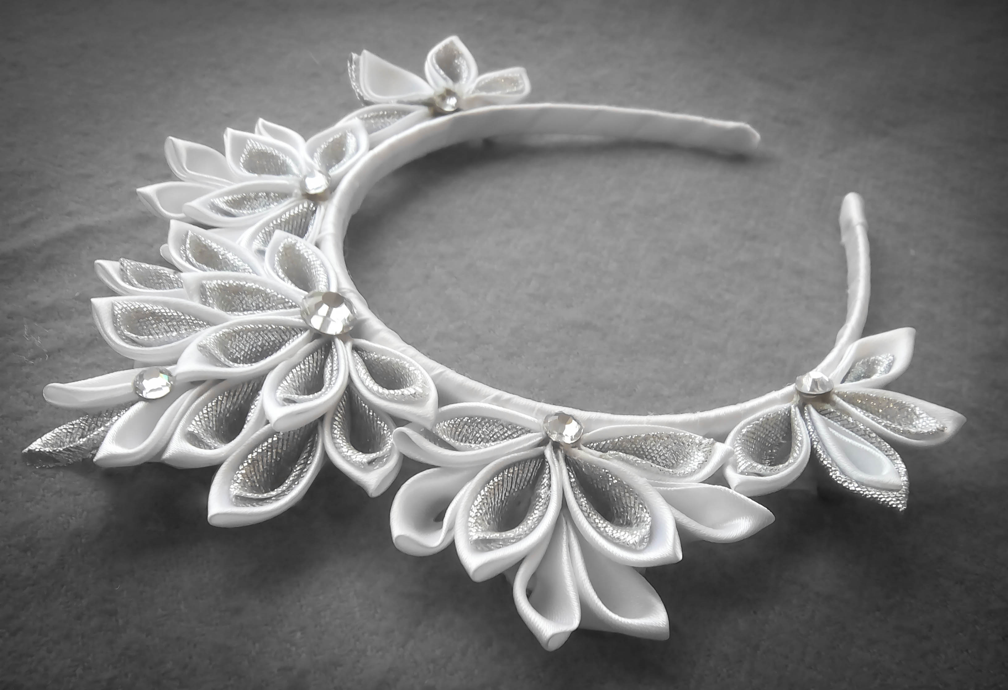 The technique is a composition of small fragments (blanks). The color of such a crown can be any (monophonic, contrast). Often, one fragment consists of two or three pieces of satin ribbons or organza. The greater the detail, the larger the pattern of the crown.