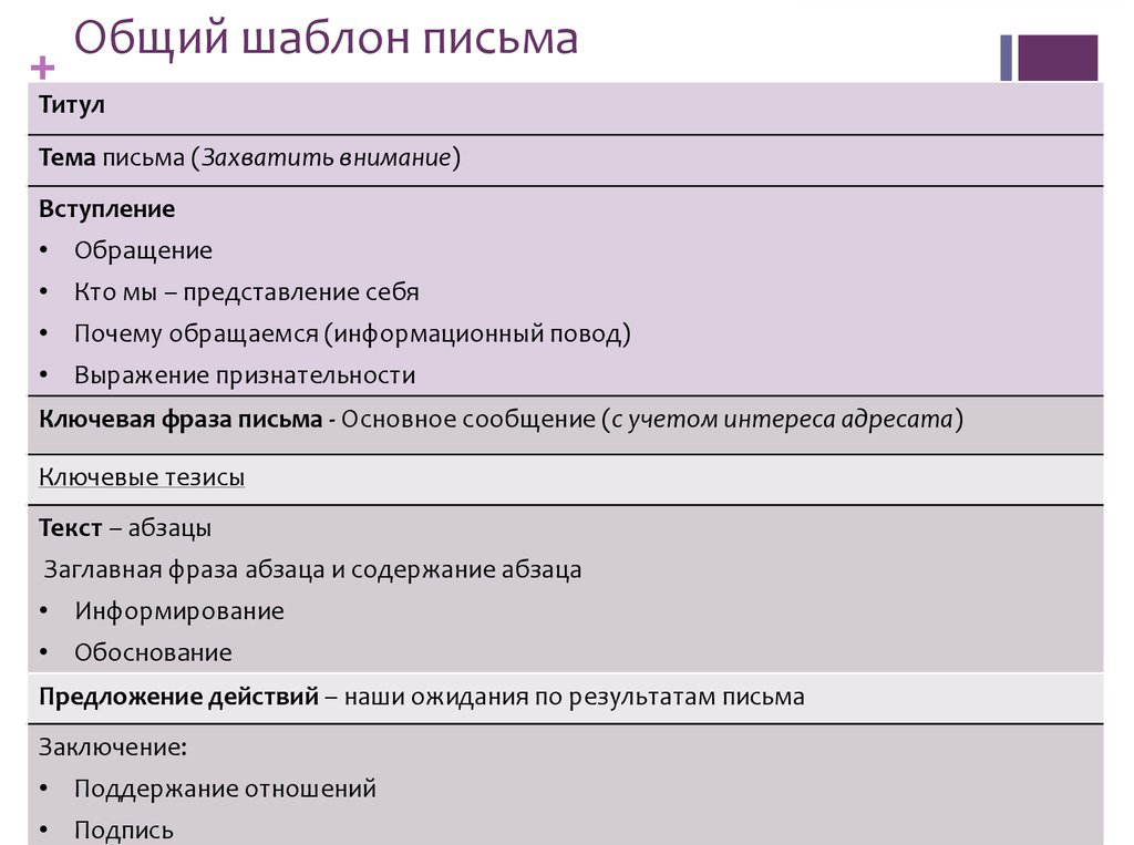 The introduction summarizes the purpose of the letter. The main part describes the essence of the issue. In conclusion, it is desirable to summarize the content of the main part, for example, in the form of conclusions. "Postscripts" and various kinds of footnotes are undesirable.