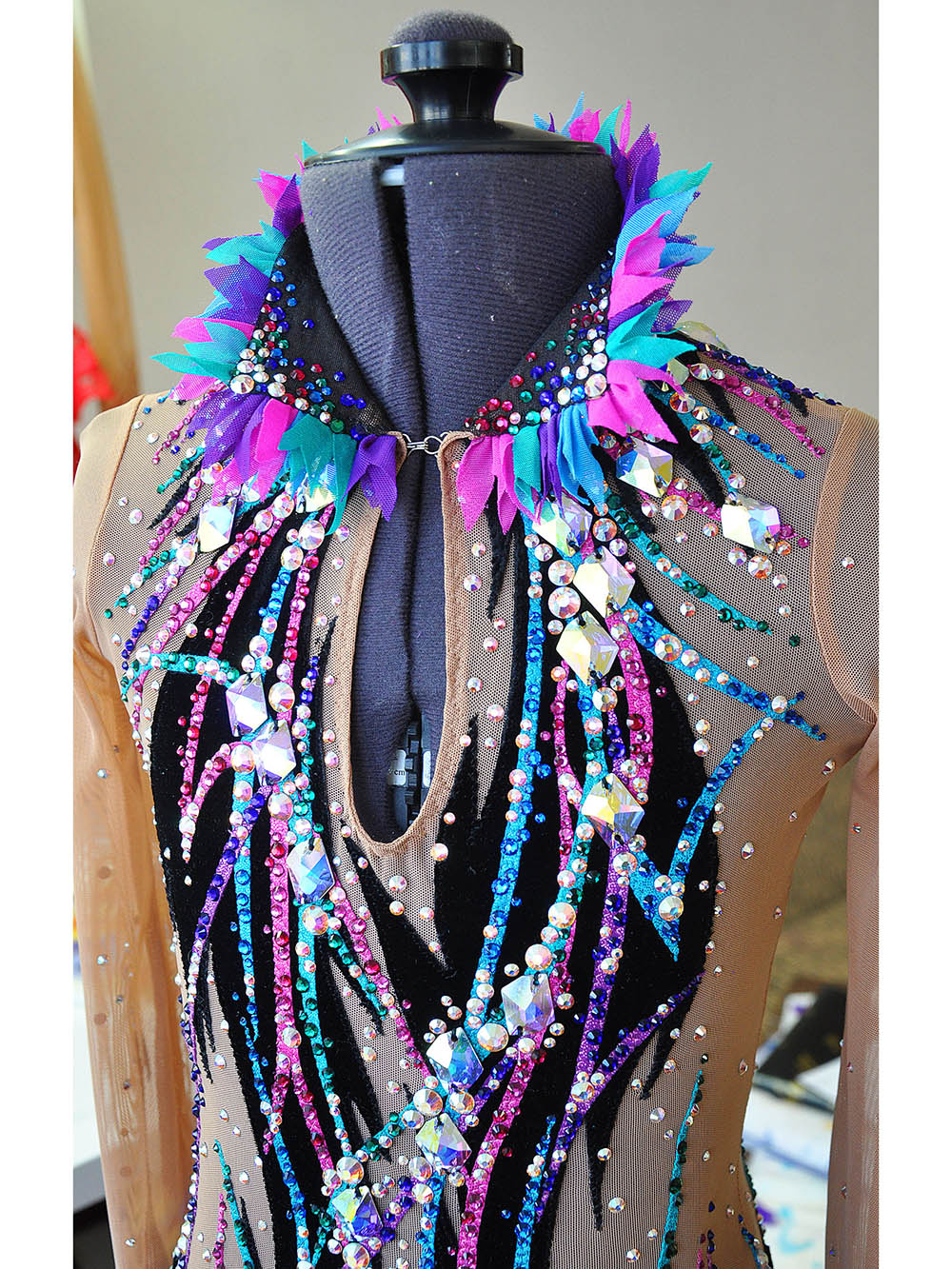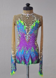 The pattern depends on the performance and submits to the created character of the image. It can be a black swimsuit with a short turquoise skirt and a scattering of orchids. Or a variant with a mesh base for natural skin tone, made in the style of a peacock feather.