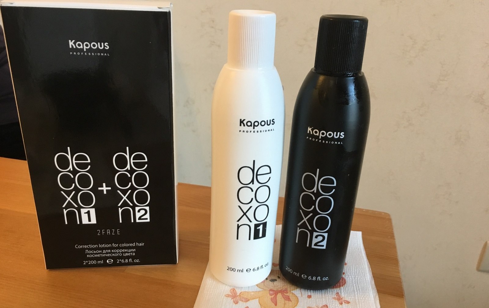 - Kapous decoxon characterized by the presence of two phases capacity of 0.2 liters. In the process of decapitation, the pigment dissolves. According to the manufacturer, the tool is suitable for full or partial lightening. The formula of the drug is considered benign.