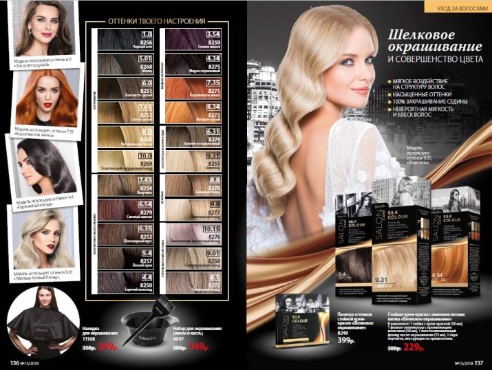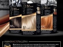 Ammonia-free hair dye “Silk dyeing” is presented in 24 colors. The basis is 9 brown and black and 8 shades of blond. Complement the list of copper, garnet-purple and light brown tones.
