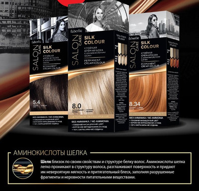 For lovers of all natural and natural company Faberlic has released a gentle hair dye called "Silk dyeing." The peculiarity of this product is the formula without ammonia. It is based on silk amino acids, which in their structure are close to the constitution of the hair, so they freely penetrate into its core.