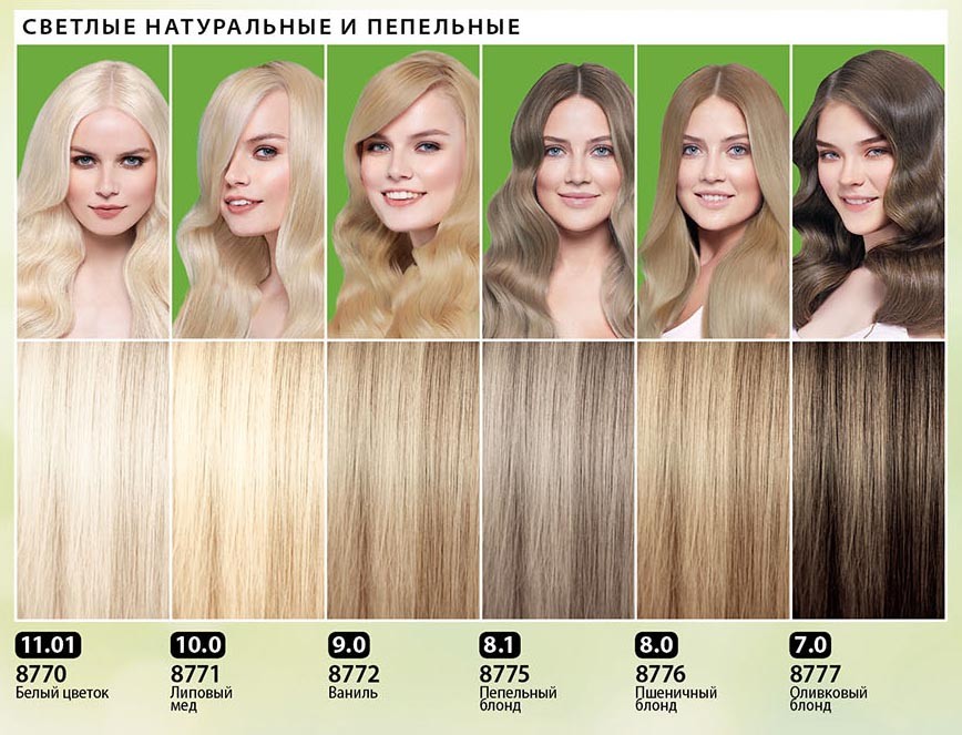Light tones are especially attractive and unusual. Blondes have the opportunity to choose for themselves stunning and unpredictable colors. The bright range is represented by 4 shades, gradually changing from ultra-bright to pinkish: white flower, linden honey, vanilla and rosewood. The dark gamut also includes 4 colors with exquisite deep shades: ashen, olive and wheat blond, spiced cinnamon.