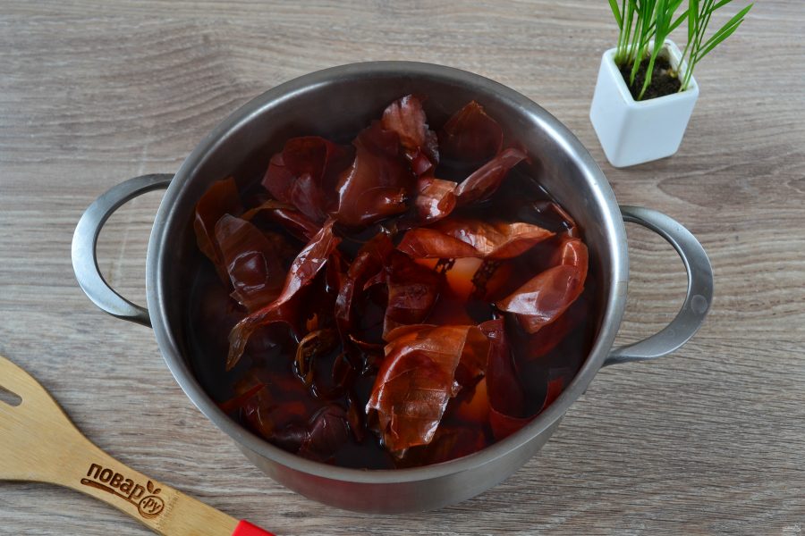 In addition, it is worth remembering that the final result, namely the intensity and color saturation, directly depends on the concentration of the prepared broth. For example, for a light golden hue, just 50 grams of onion peel is enough.