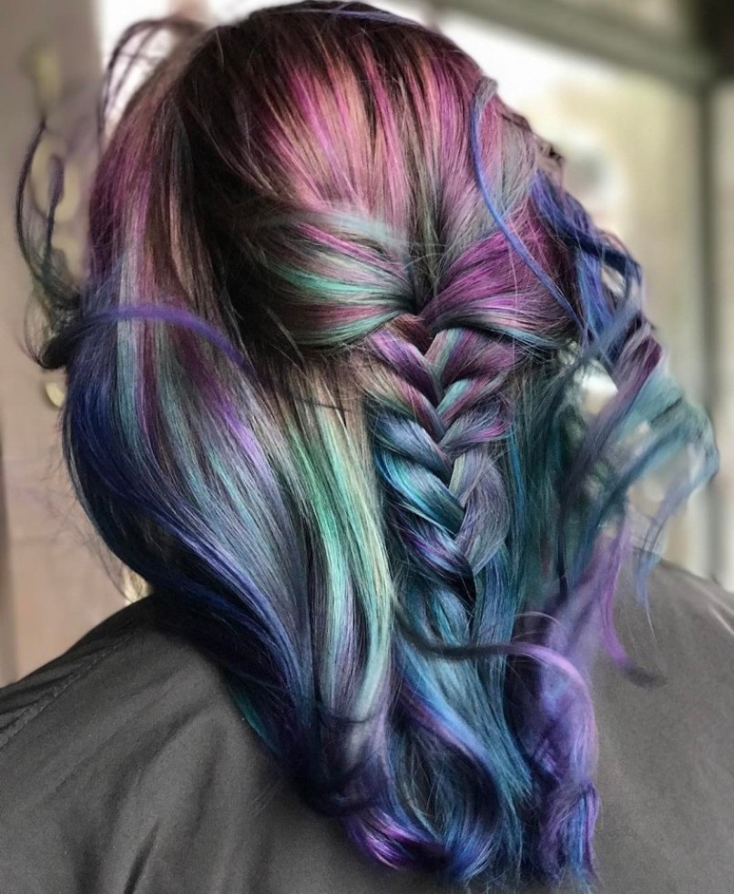 - "Oil slick". On black color there are violet, blue and green strands.