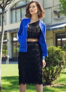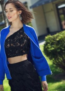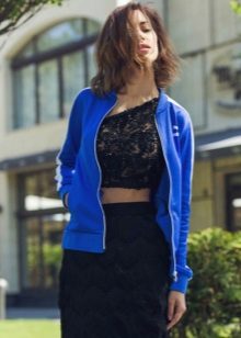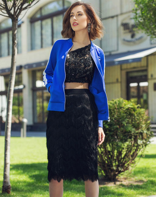 This image is a balance on the edge of sporty chic and casual style. Two shades of buruzovy and bright yellow are the ideal partners shading each other. Despite the fact that the shirt is an element of sportswear, a soft textile skirt is perfect for her.