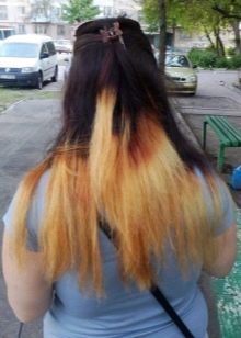 The border can be made flat or started up diagonally - this is achieved with the help of hair ties, which fix the hair in the tails and form the desired line. After washing off the paint and slightly drying the head with a towel, you can once again toned the ends of the hair, if the desired effect is not achieved. After waiting for 20 minutes, wash my head with balm and dry.