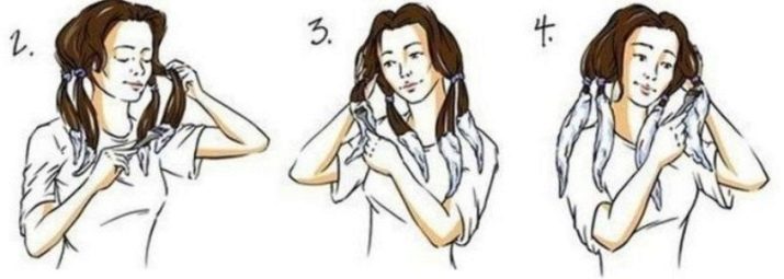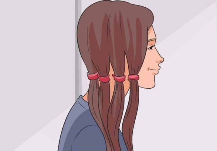 - Hair should be divided again into strands and collected in tails. It is advisable to twist into bundles. The more tails you make, the more natural the transition will look.