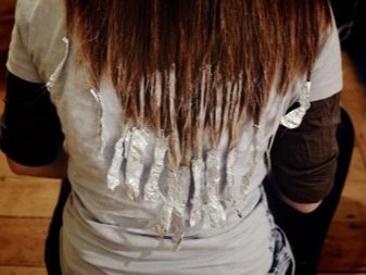 - Wet hair is combed, and then divided into 2 parts using a horizontal parting. Each is divided into thin strands and cover the clarified area with paint of the desired shade. Coloring is carried out using foil.
