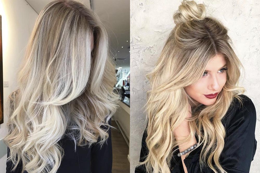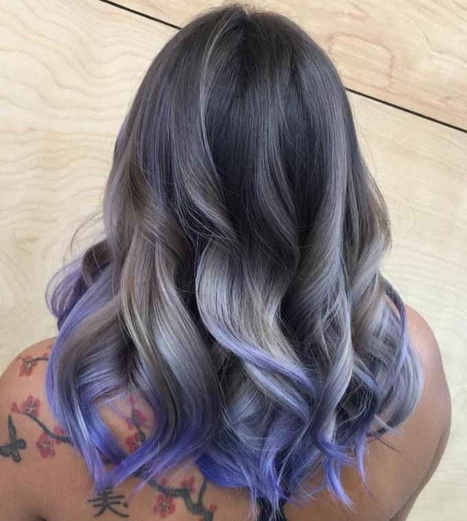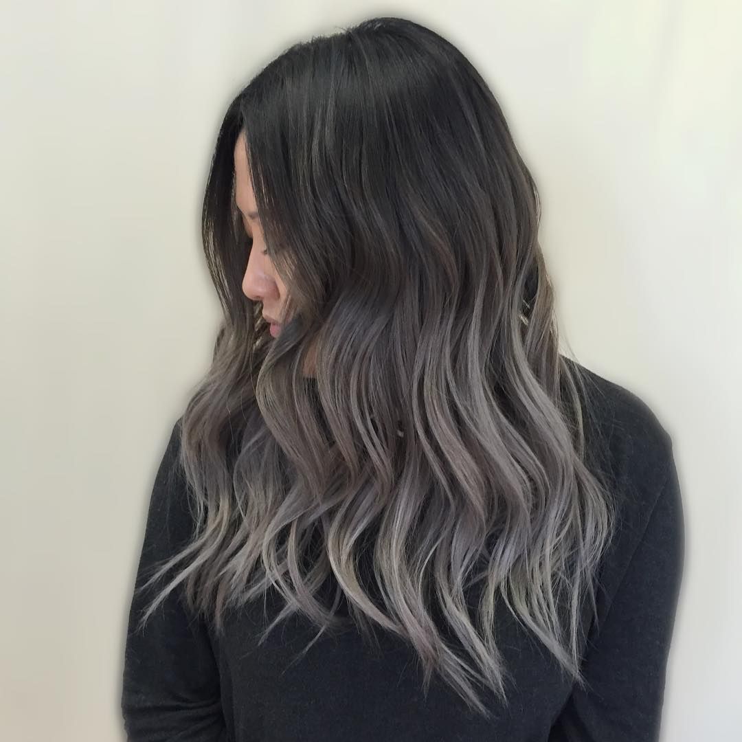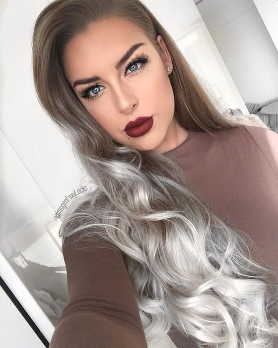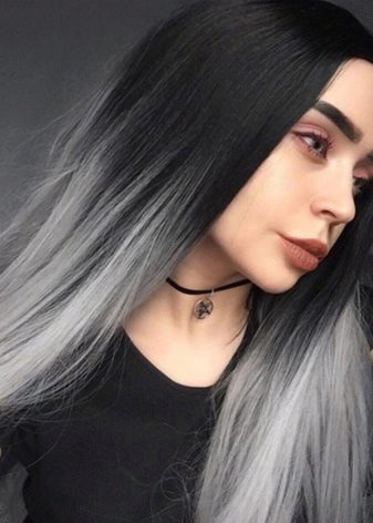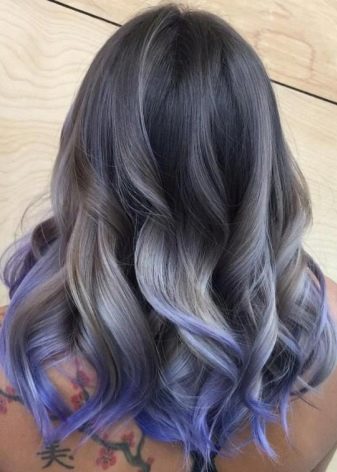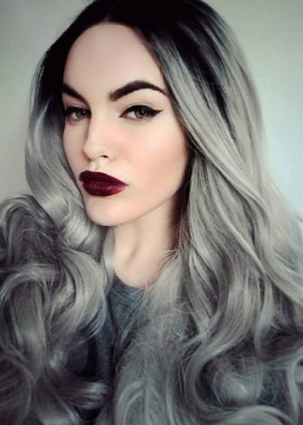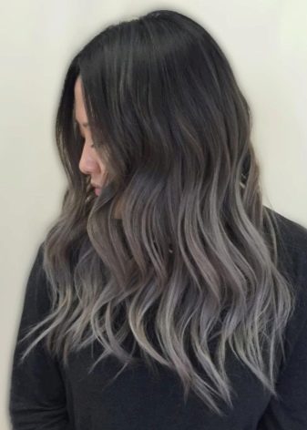 One of the most popular trends of the last seasons for owners of black and dark blond curls is ash ombre. In this case, a variety of shades of gray colors are used, which creates a rather unusual, but extremely effective image. This type of coloring is ideal for women of cold color type, with white skin and bright eyes. In this technique, the roots are left unpainted, the middle part of the hair is colored in black or steel, and the tips are lightened to a pure blond of platinum or pearl hue.
