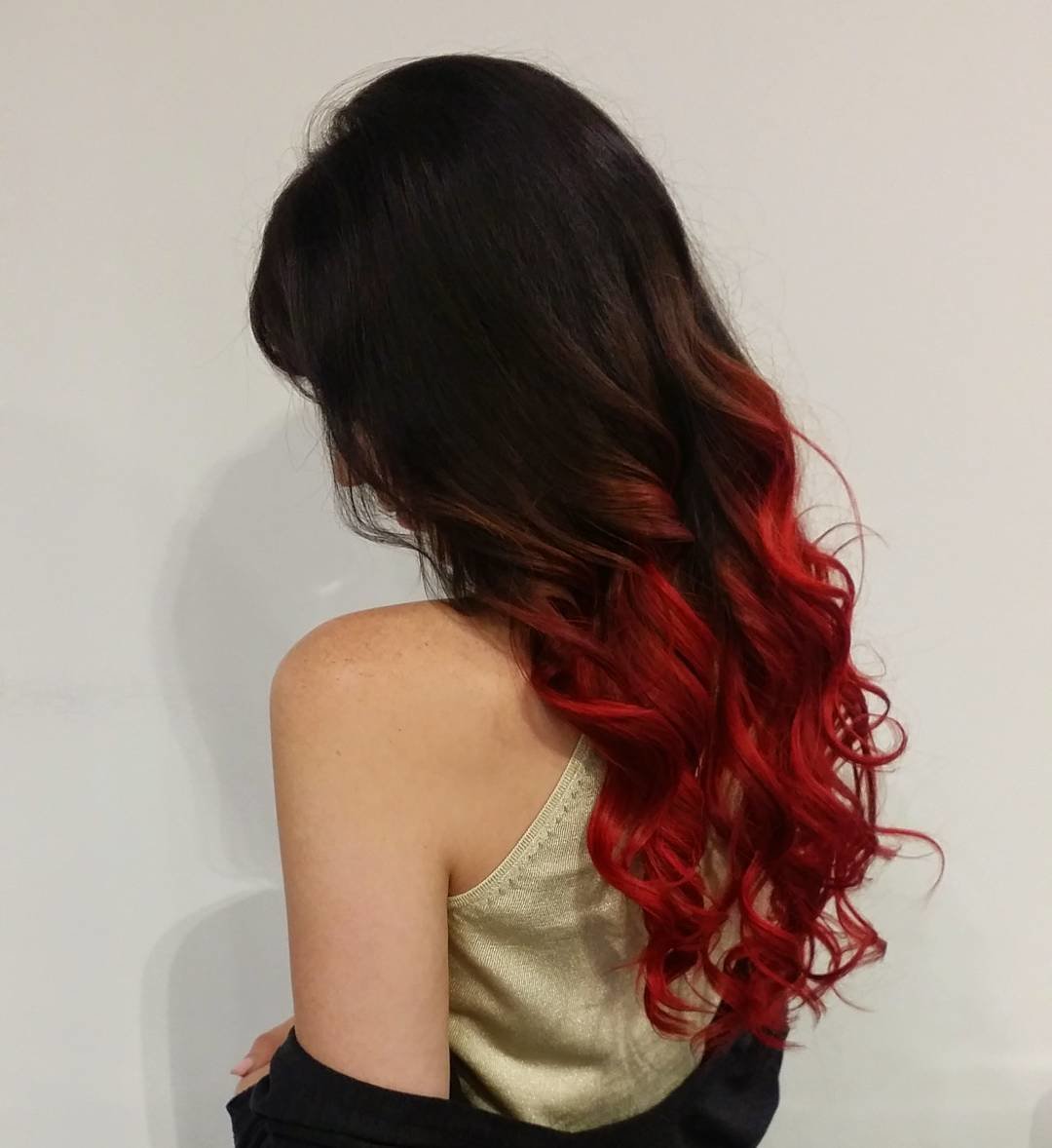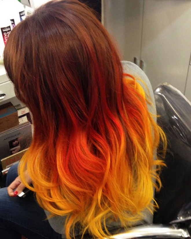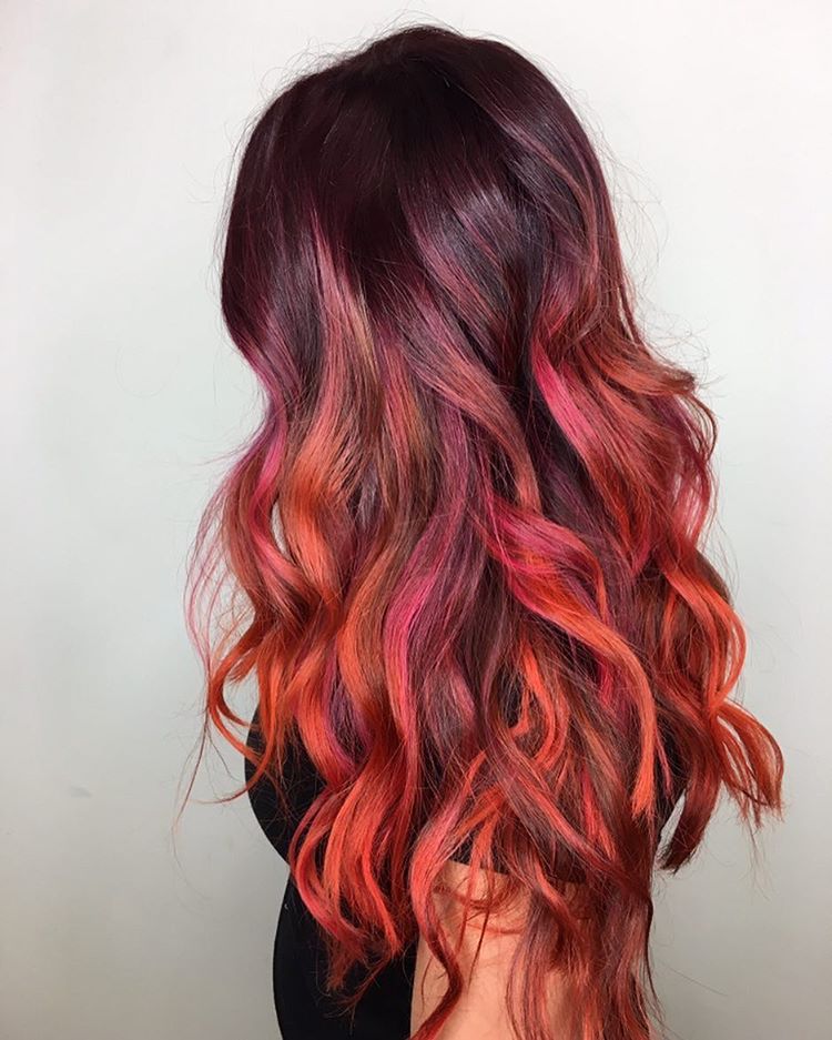 Dark strands look great in a gradient with red hues - copper, red and tangerine tones are popular here.