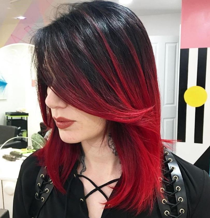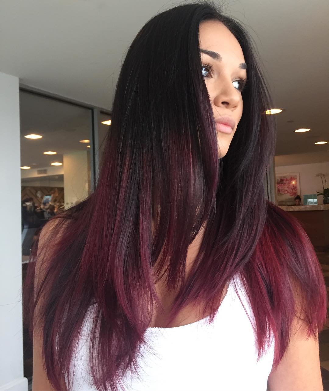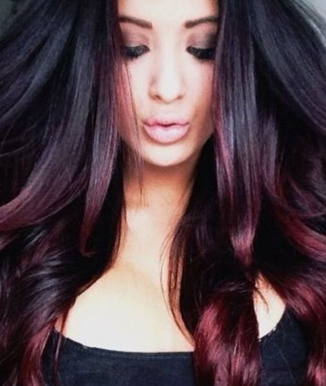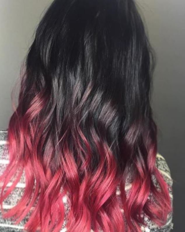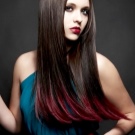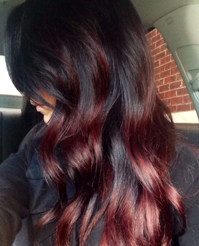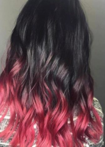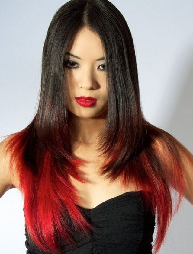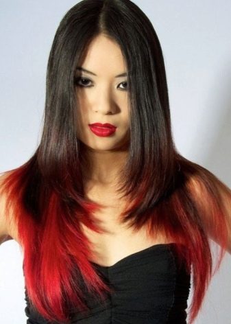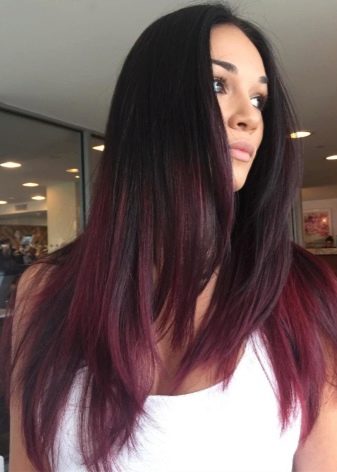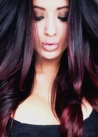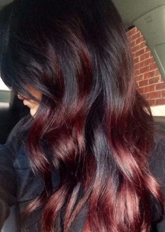 The use of red dye on black hair looks very impressive and bright. The length of the hair should be medium or long, so that the color transition is smoother and more natural. This option is suitable for self-confident girls and women who love the attention of others. Often light colors are used to dye dark hair. You can make the tips of the hair ashy or light brown.