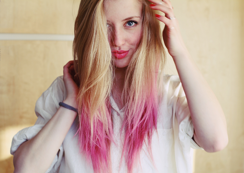 The ends will be painted with food coloring of the desired shade. For the procedure will require a white balm, a bowl with a brush and the dye itself. A pair of pigment sachets and 100 grams of the product are mixed in a container, after which they are applied to the necessary areas of hair and, if desired, twisted into foil. Somewhere in half an hour the paint can be removed.