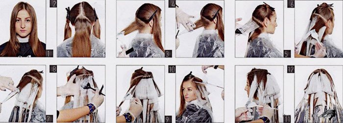 In the second case, the treatment procedure begins with the fact that the hair at the roots are covered with a dark shade. Ten minutes later, the same composition is distributed to the middle of the hair. Finally, the ends of the hair are covered with a light shade and wrapped in foil. Having sustained time specified in the instruction, the head should be washed, using shampoo and balm.