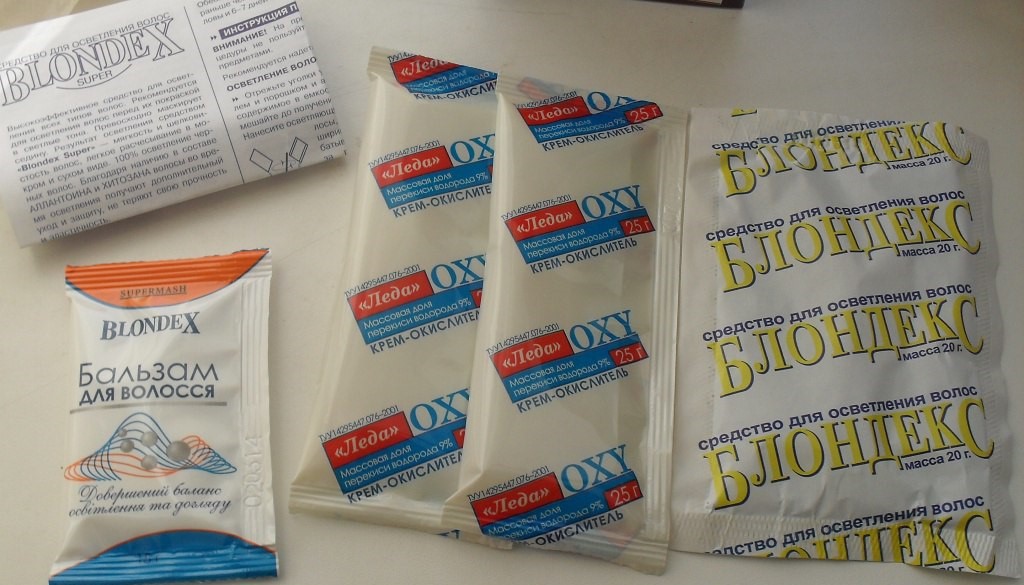 As mentioned above, this tool is easy to use at home, since all the necessary components are sold in one box. The kit includes: disposable gloves for hands, bleaching powder of blue color, oxidizer and caring balm after staining.