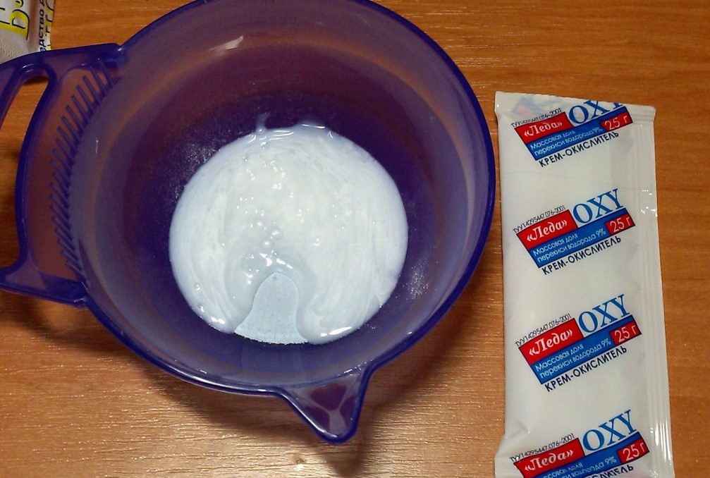 - Preparatory. At this stage it is necessary to mix the oxidizer with the powder to a state of homogeneous mass, first wearing gloves. It is also worth taking care of the state of clothes, so you can wear an old bathrobe or use a hairdressing salon.