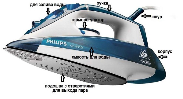 The device is a symbiosis of iron and steamer. He has a separate tank of water. The device itself is identical with the iron. Through a hose from the reservoir steam is supplied under pressure. He gets on the fabric through the holes in the sole of the iron.