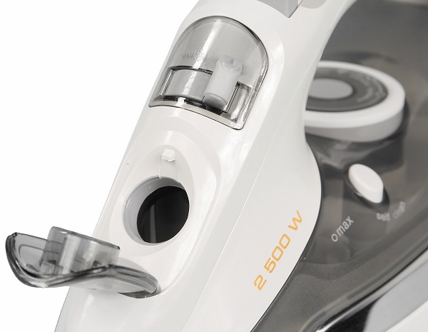 - The steam supply button is located below the handle. It is very convenient to clamp, if you need a constant supply of hot air. But you can iron and in normal mode. But do not leave the tank empty, as it will heat up and without liquid may be damaged.