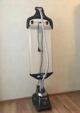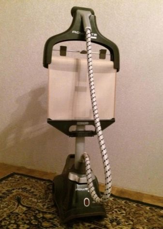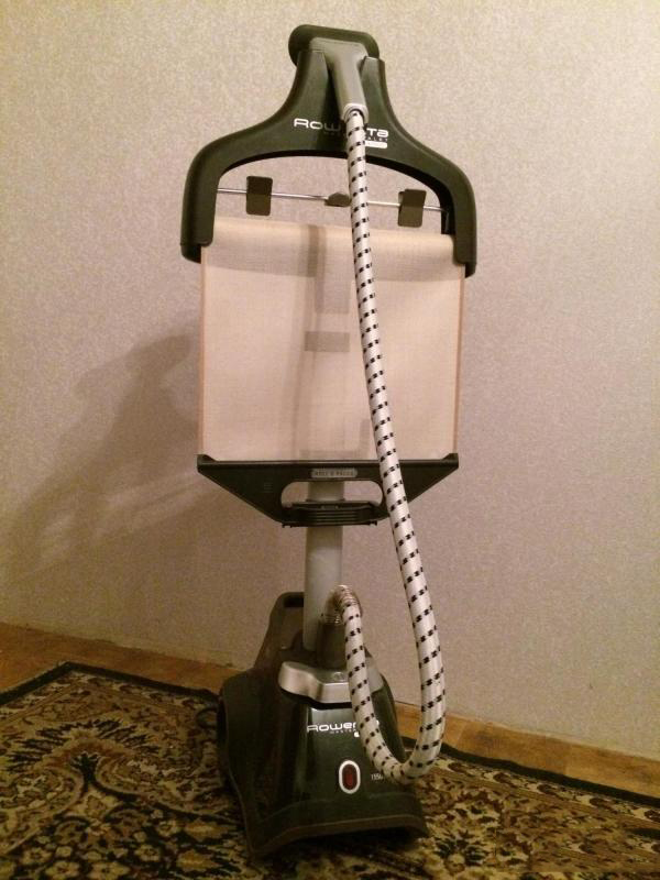 - Rowenta Company It offers a decent option for those who need a good thing that can please the owners for many years. The stylish vertical device can be moved around the room without any problems. It has volumetric wheels that are easy to maneuver and a fairly long cord (2.6 meters), which allows you to install the unit where it will be more comfortable to iron. In the configuration there is a double telescopic aluminum stand, the height of which can be adjusted. With its help, you can adjust the hanger to the height of a person so that it is extremely convenient. Another good news for active users - the model has a foot drive. The front part of the body is equipped with a power button, which allows you to control the device with comfort. The cord is wound automatically, there is a built-in tank in order to store additional accessories. The handle is comfortable, helps to move the device. There are indicators for water level and hot air supply.