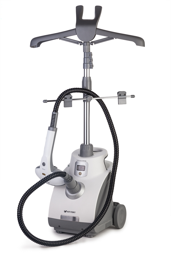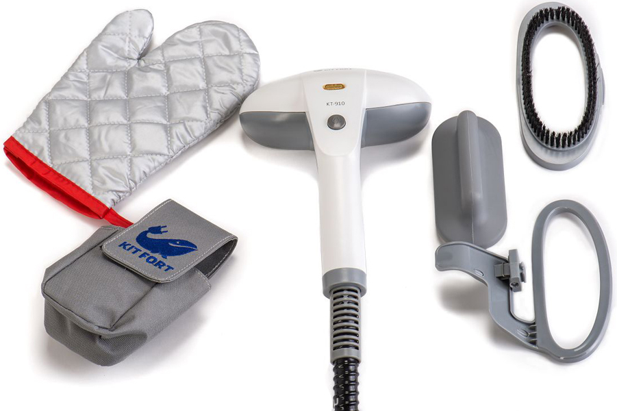 - Kitfort KT-910 It has many accolades from grateful users. The main quality of this device is that it has a useful option - a sensor that monitors the water level in the tank. The package includes a steam hose (one and a half meters), a capacious tank for liquids (1.8 l). Power - 2200 W, so the device works with dignity and quality. You can use the steamer 30–40 seconds after switching on, which saves the user's time.