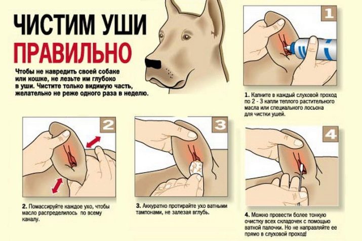 The shepherd's ears are cleaned several times a month, using a cotton swab and a dog ear cleaner. If there is no access to a veterinary pharmacy, the lotion can be replaced with hydrogen peroxide. After the cotton wool is moistened with a stick, it must be pressed. Cleaning the ear occurs near its edges, across the entire inner surface, without lowering the stick inside the ear. The movements are also light, not pressing.