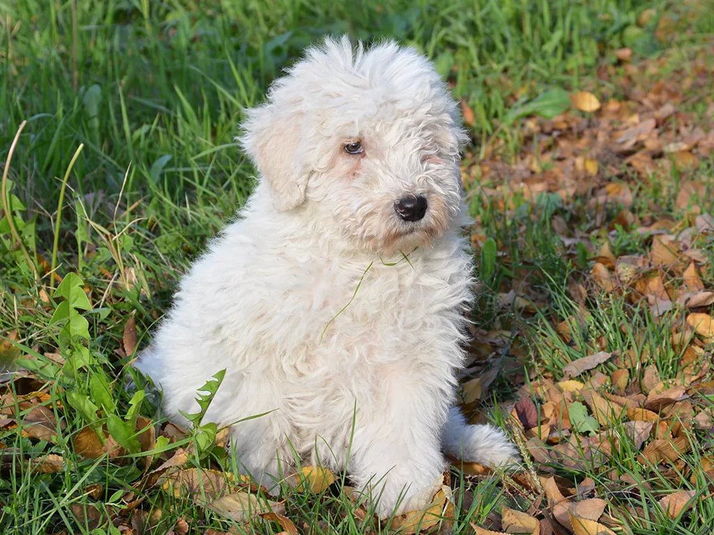 According to the standard, the coat color of this Hungarian Shepherd Dog is white, but the presence of a light ivory shade is permitted. Komondor kids have a cream, yellowish fur, which turns into white after molting.