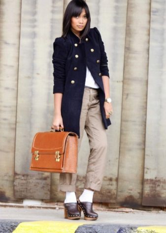 When choosing shoes, women of fashion have greater freedom, since the English coat can be combined with elegant semi-boots, boots with a flat sole or heels (steady or high). Do not forget about the shoe. They harmoniously look in combination with an English-style coat.