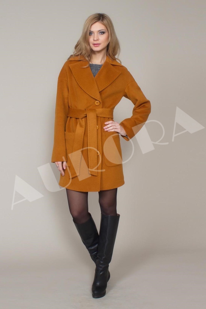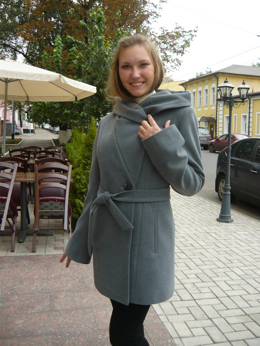 A double-breasted medium-length product with an English collar will embellish a classic business style. The accent of the model will be a wide black belt, emphasizing the waistline. The product is presented in a smoky shade.