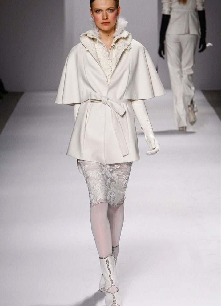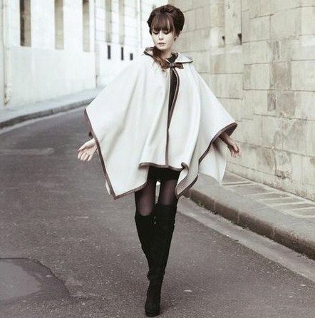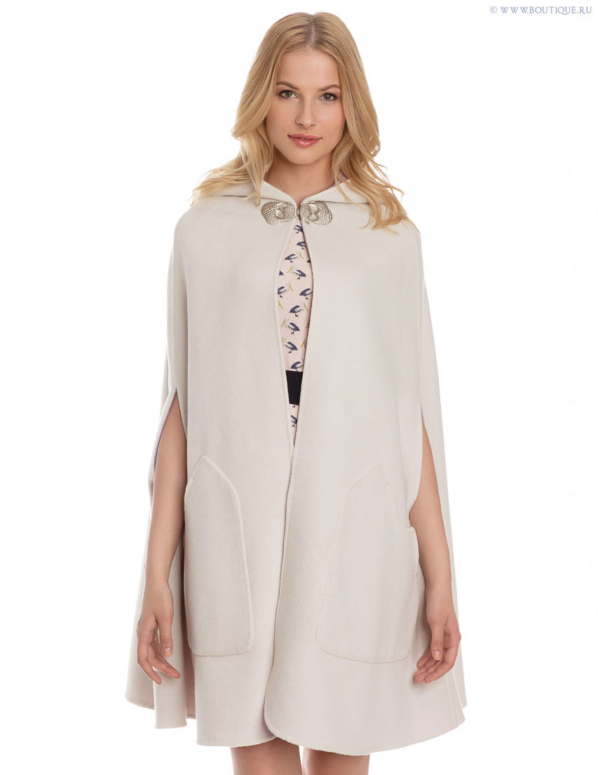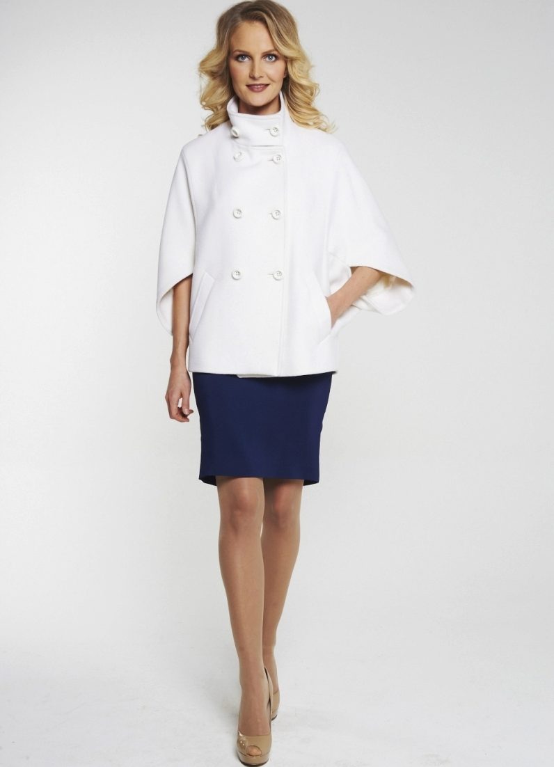It is gaining popularity among women of fashion coat - a cape, which in white color looks like a real chic. A wide-brimmed hat will work well for him, and will complement the image of an elegant lady's pencil skirt. But under the long cape to the floor - the mantle is recommended to wear black leather pants. You can also pick up a monophonic dress.