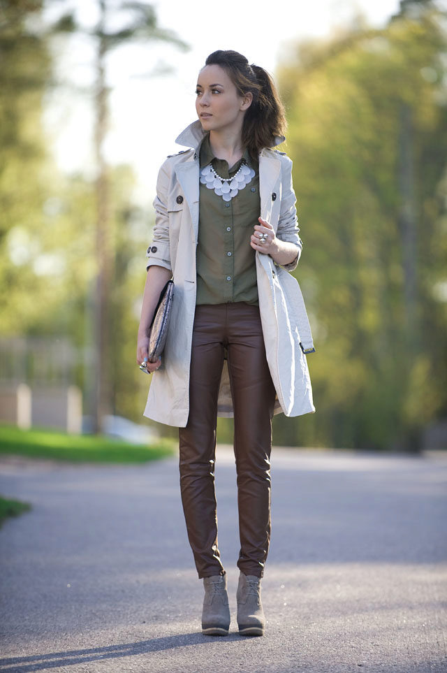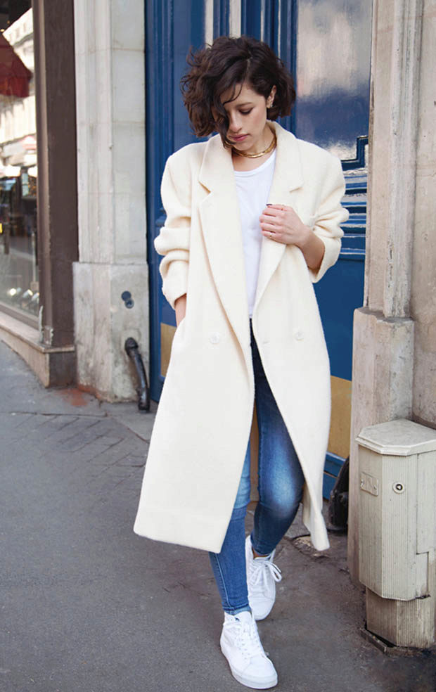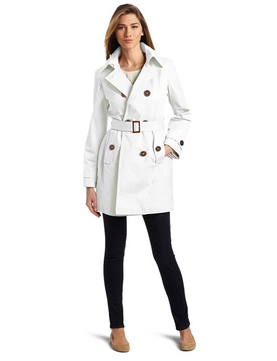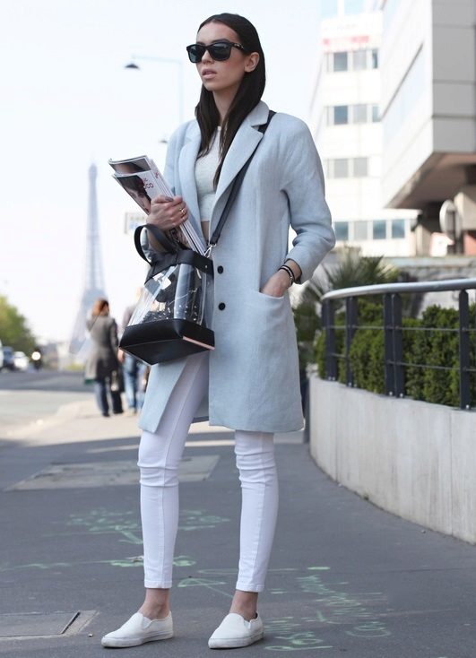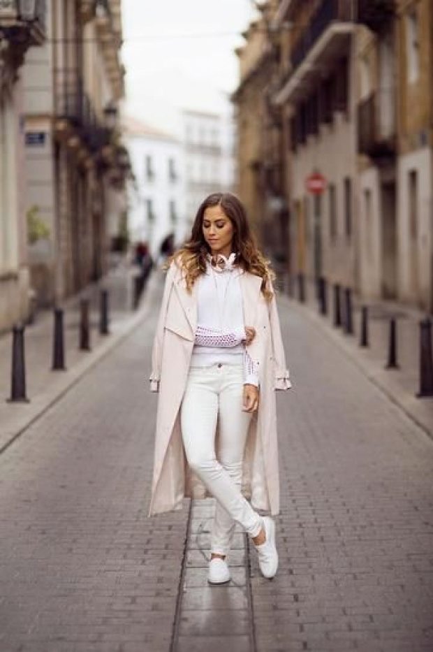 A white trench coat will look perfect with jeans. Under it you can also wear leggings and tight pants in soothing tones. Stylists do not recommend wearing ripped jeans or trousers decorated with rhinestones for such a trench coat. These are completely different styles of clothing.