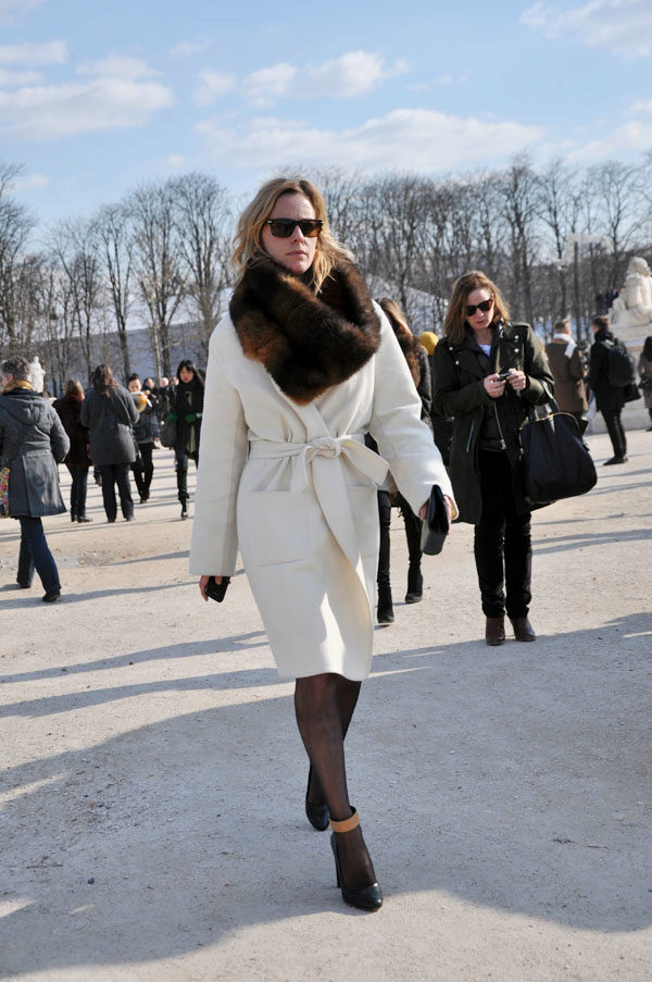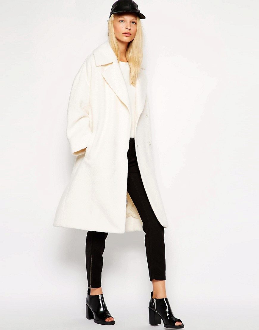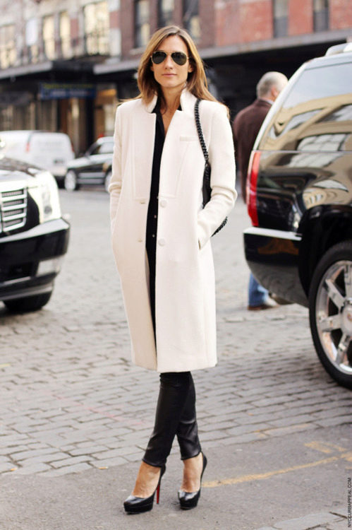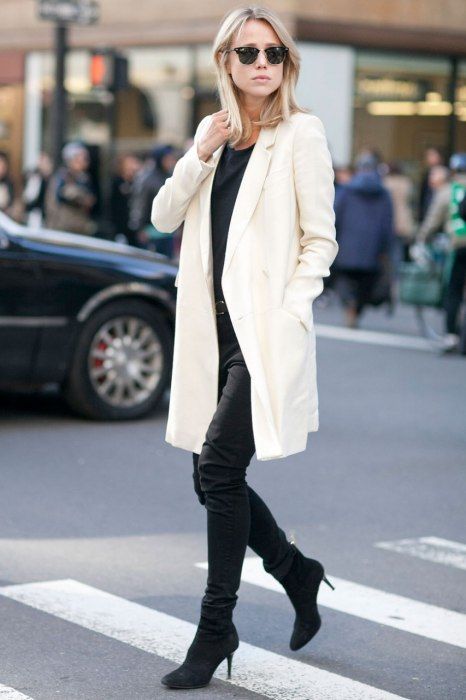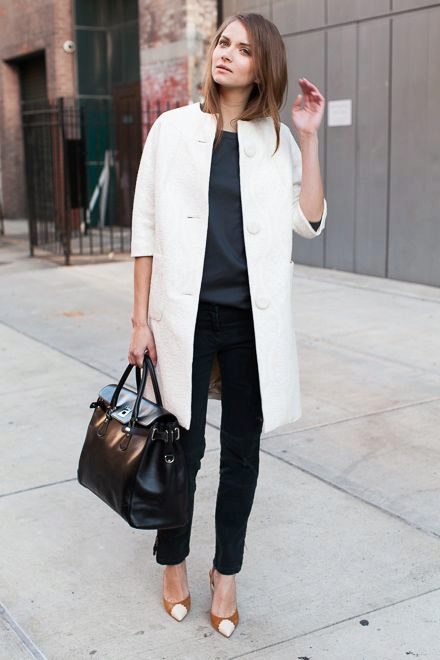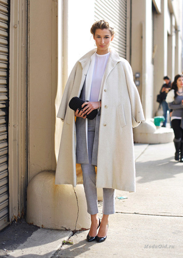 When creating a fashionable image should follow the recommendations of stylists. A short white coat will look good with black pants, preference should be given to pipes.