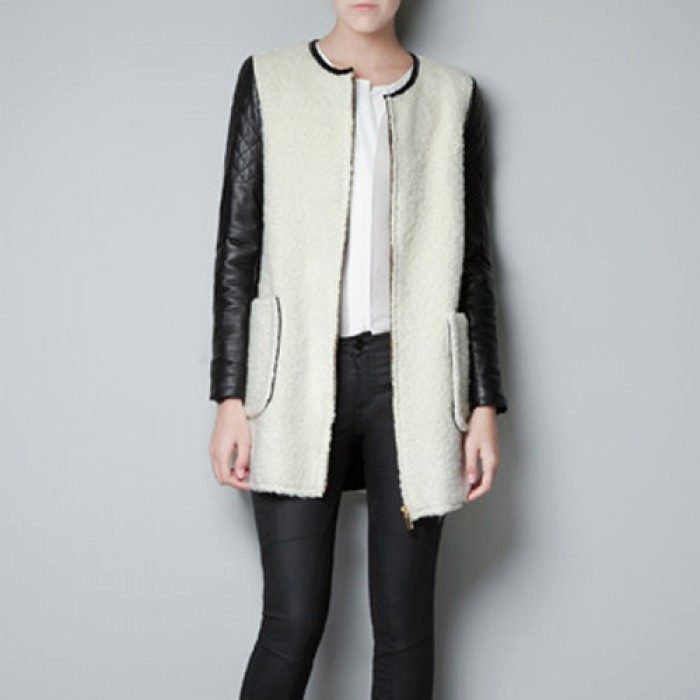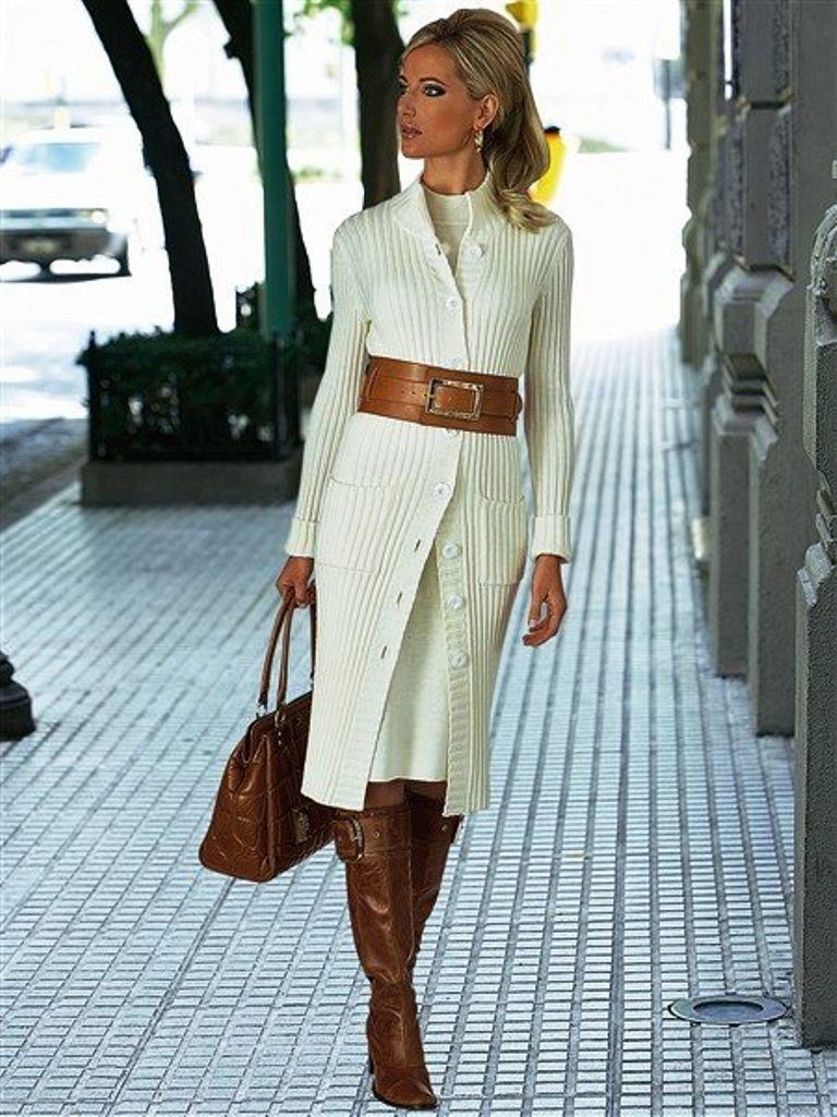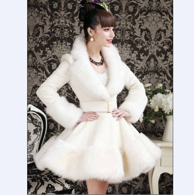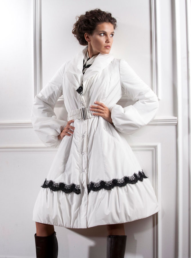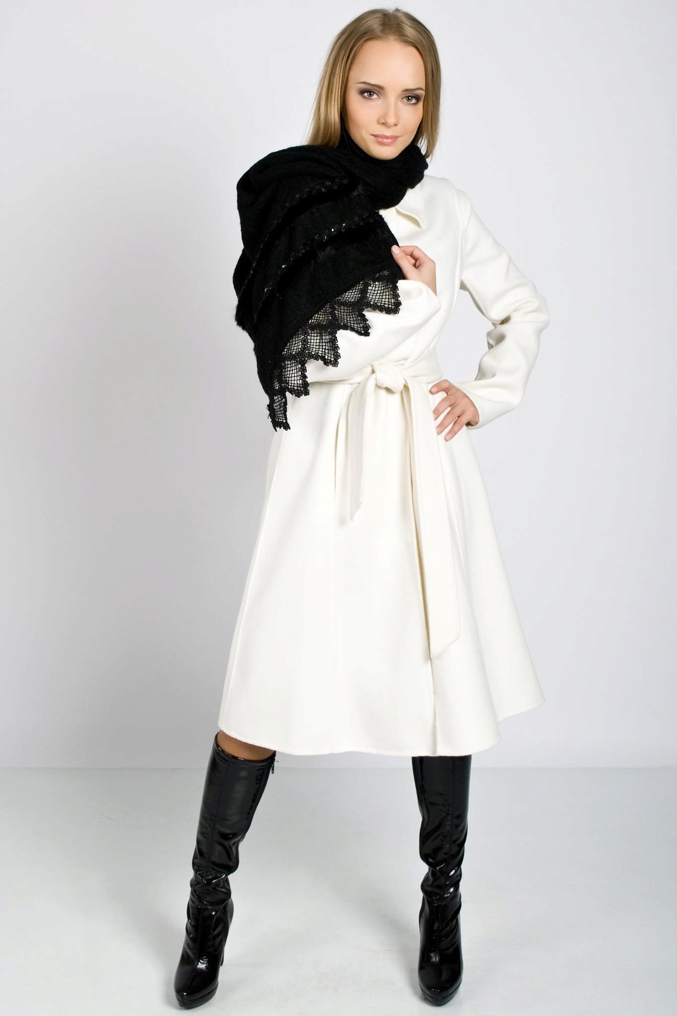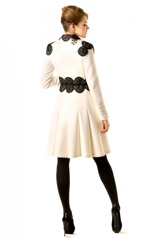 It is possible to wear a long skirt under such a coat, but a short black dress looks particularly impressive. The white color is very friendly with other colors and when making a dress you should prefer the emerald, sapphire, gold, silver, coral and bright yellow which is fashionable this season.