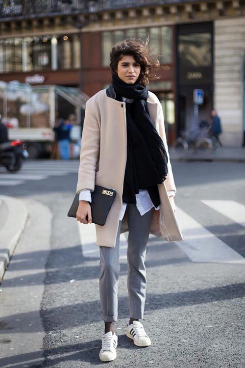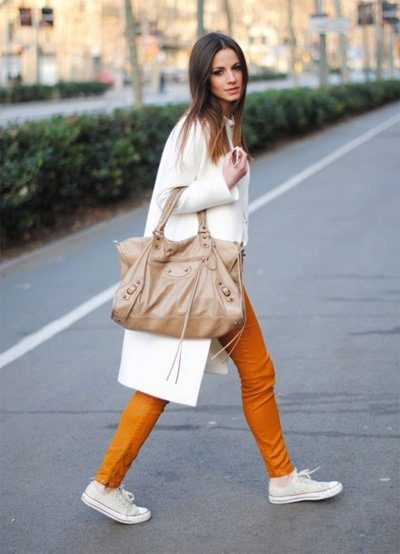 Popular street style will make experimenting with the color of shoes and clothes. It goes well with jeans, not only the traditional blue color, you can pick up pants bright colors. Bright moccasins and colorful sneakers are perfect for this look.