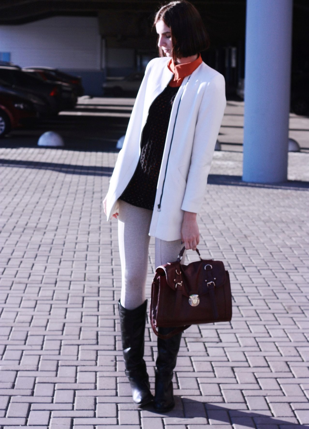 The most important thing is that it should be monophonic, calm in color, without additional decorative details. It must be remembered that a white coat should remain central to the ensemble of the entire outfit.