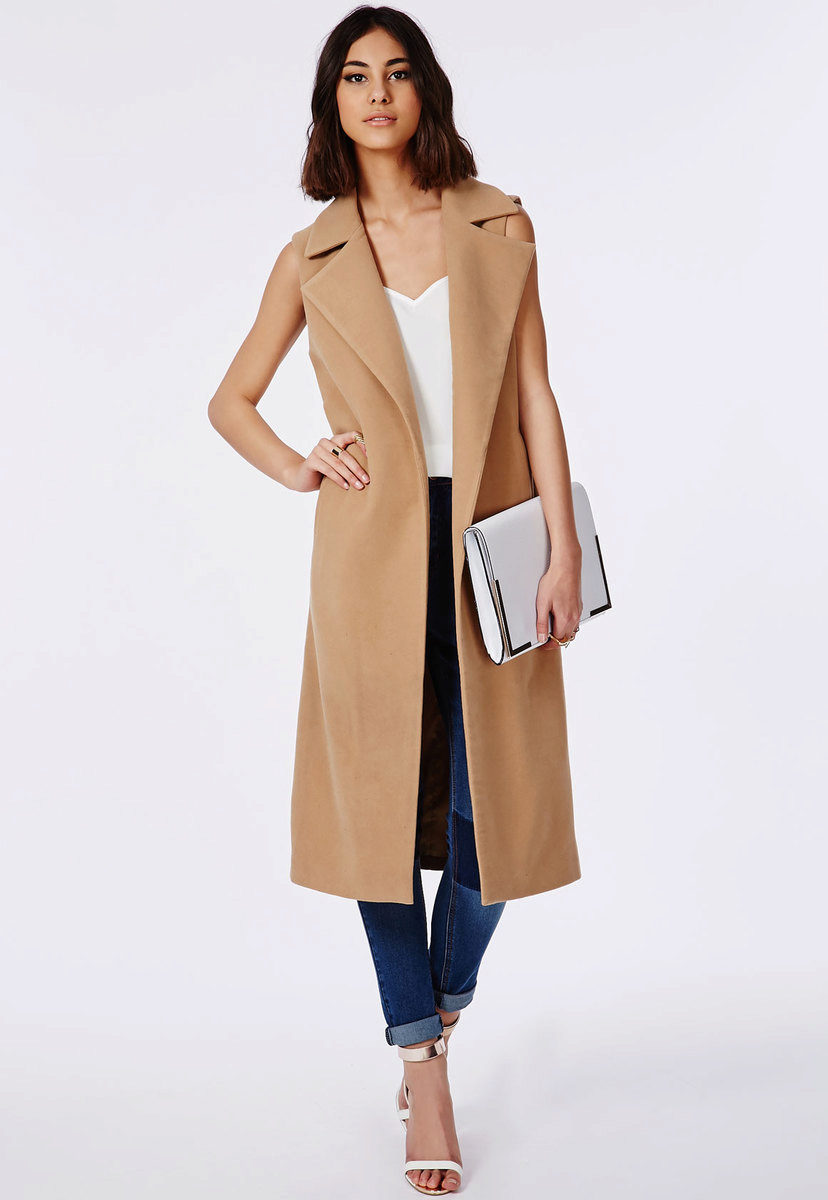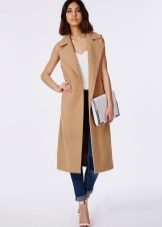 The beige sleeveless coat is a fashion trend, it can most often be found in fashion blogs and glossy magazines.
