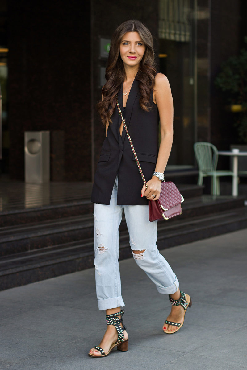 A long coat-vest gives a bohemian look to the image, so it does not need bright unusual bows. Moreover, it will be the perfect complement to minimalist images. One of the possible options is black pants or jeans, a white shirt and boats in black or beige.