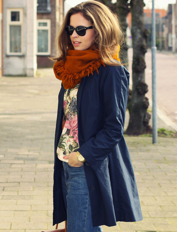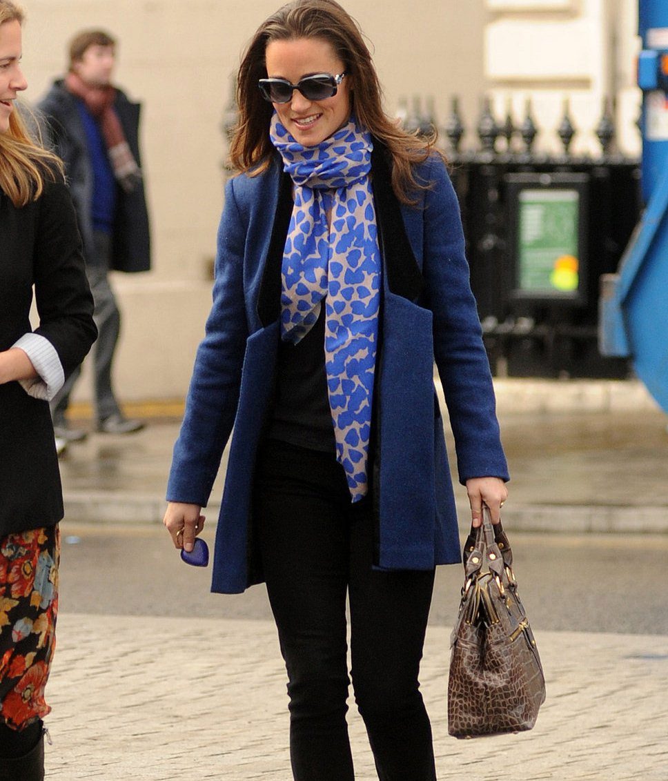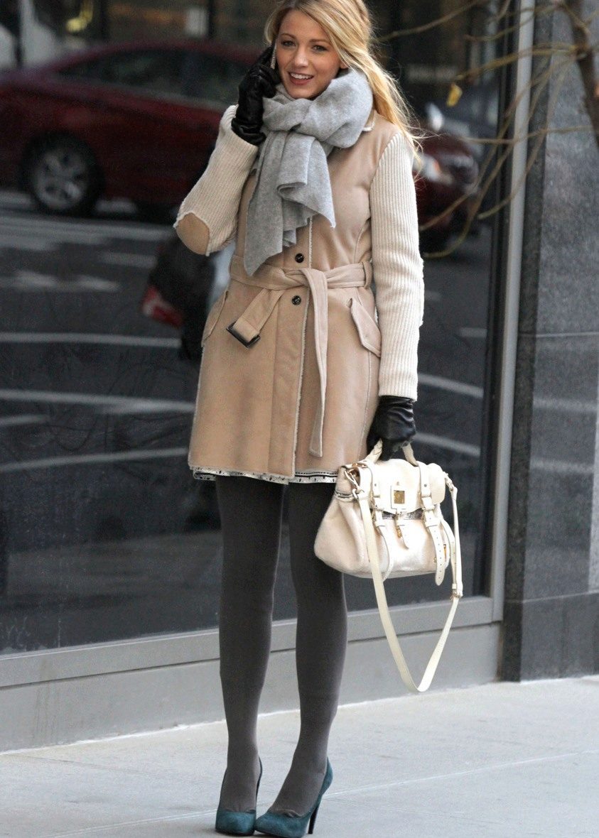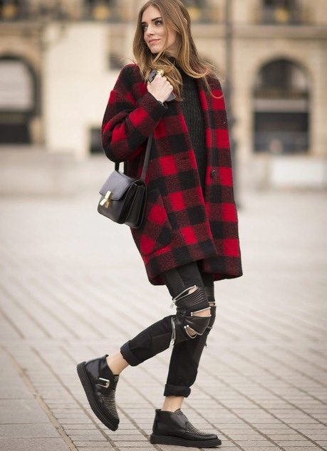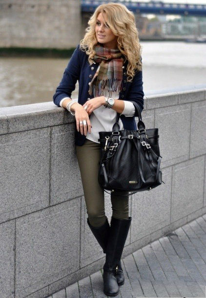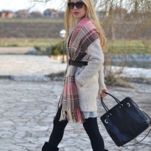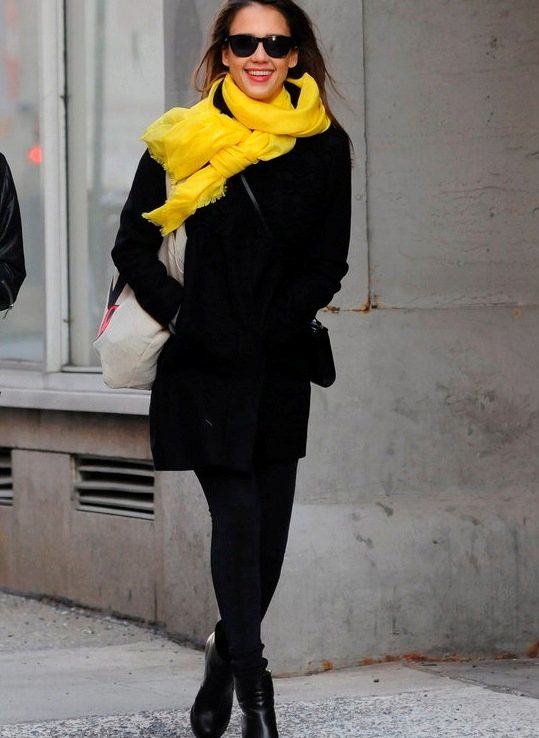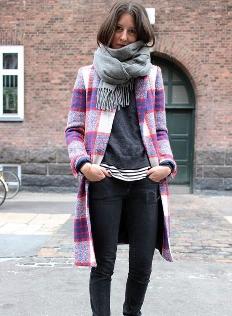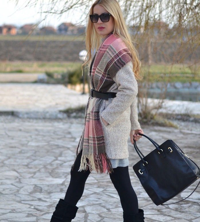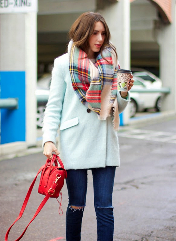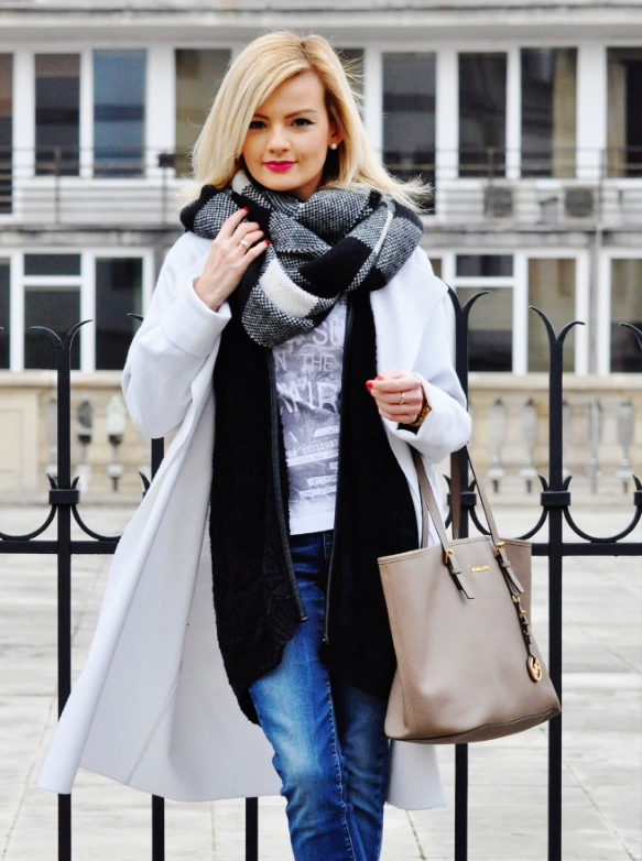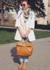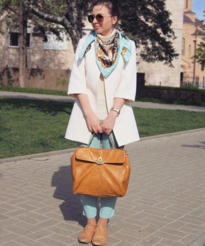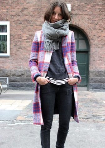 Here is an example of an ideal image in all respects. White coat with a black sweater and blue jeans. The wide scarf in a large cage is knotted in the form of a free twist with hidden ends. In this image the rule of three colors is not observed, but it didn’t spoil it, on the contrary, it emanates from it femininity, lightness and ease.