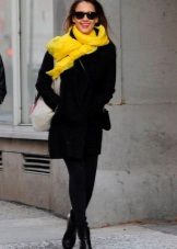 A plain coat of a calm color will look more interesting if a scarf is formed from a scarf one turn. A thin strip formed from a scarf is ideal for a business image. In this method, you can use a brooch or form a tie or any other knot.