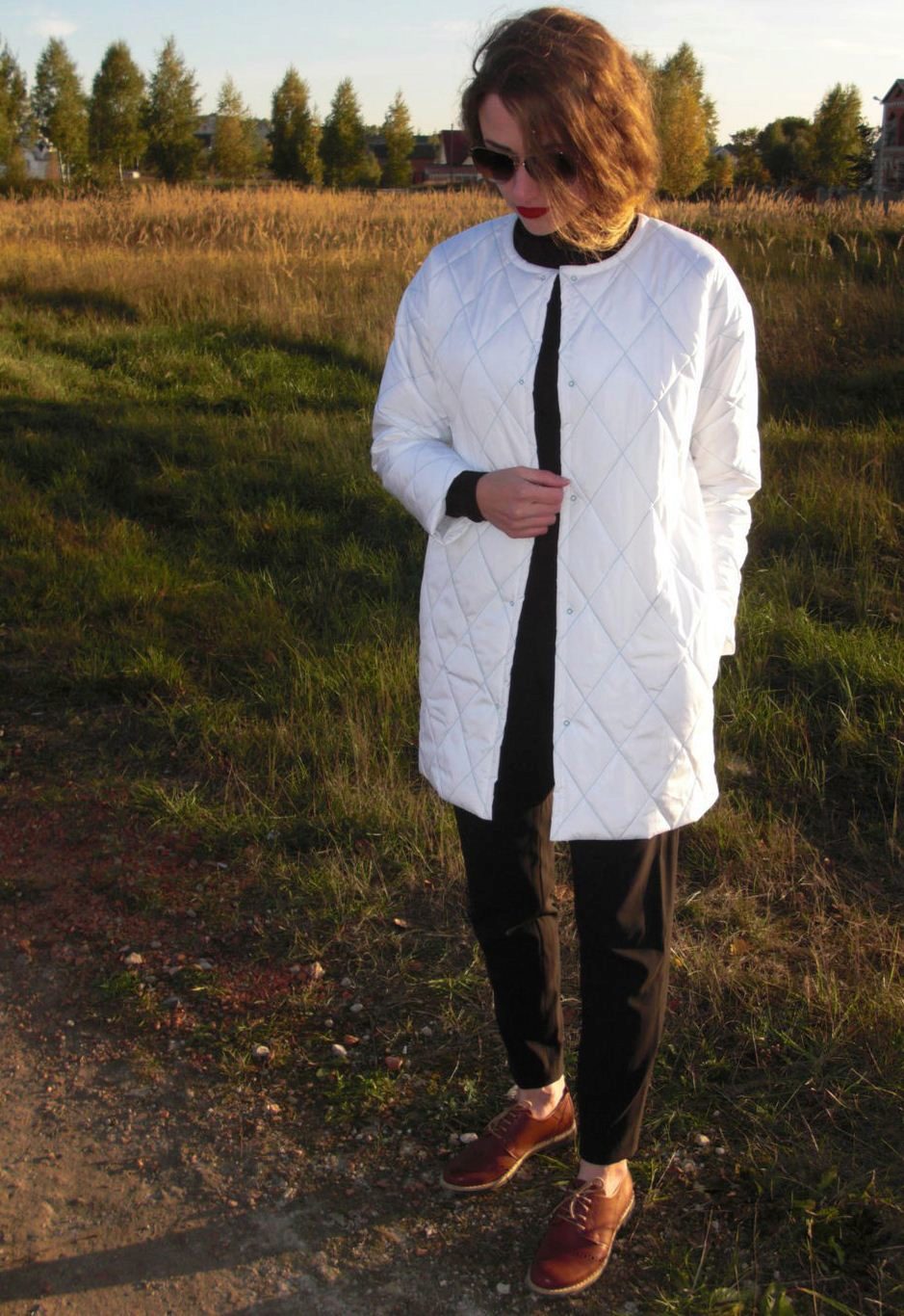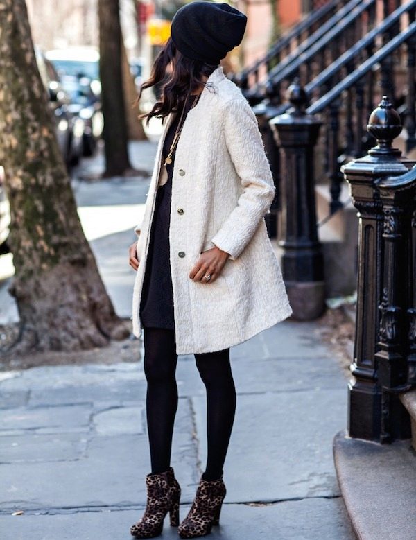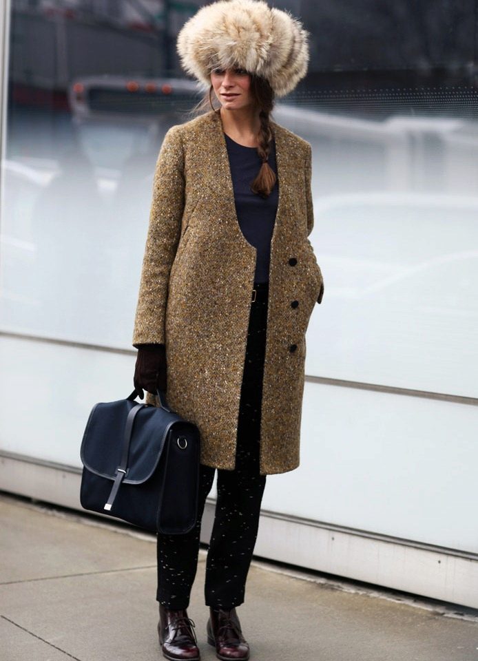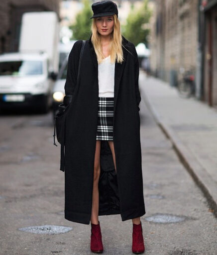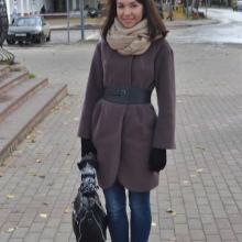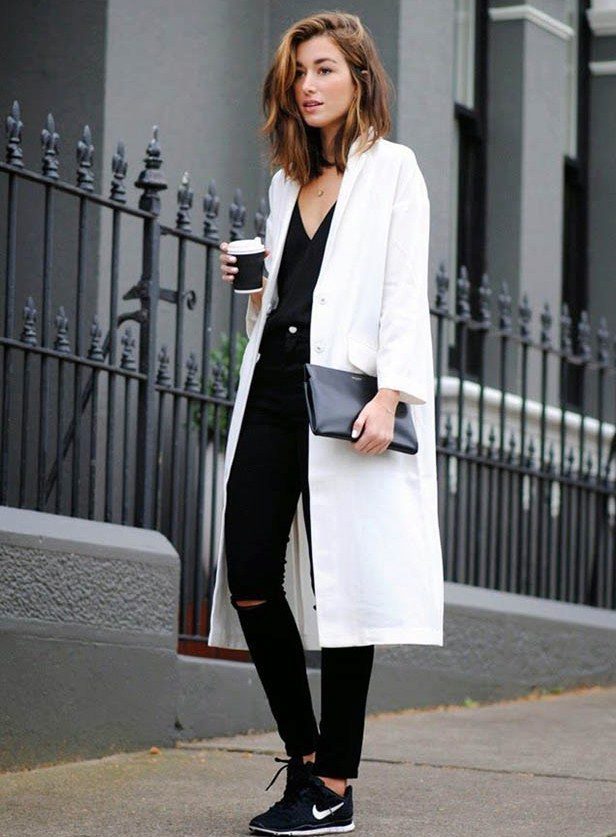 If the coat is made by straight cutthen the skirt or dress should not peek out from under the coat. Be sure to follow this, because such a small detail can ruin even a very well thought out image.