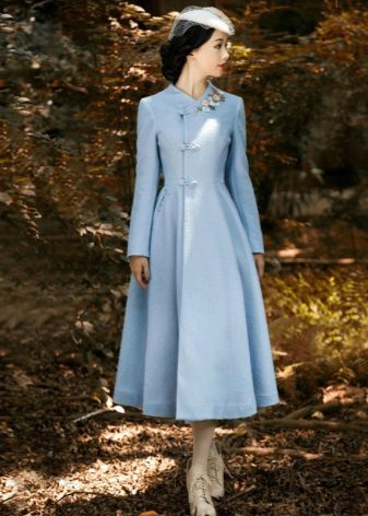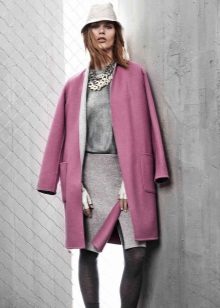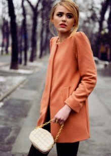 If your coat without a collar has average length, then you will need to pick up long dresses, straight skirts and discreet shoes, for example, high boots would be a very good option.