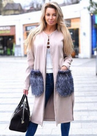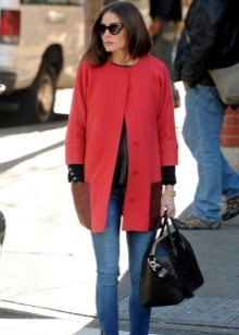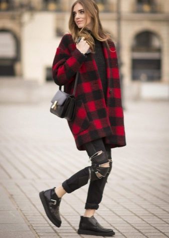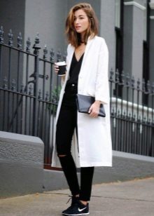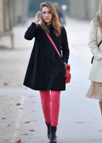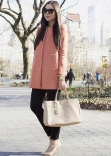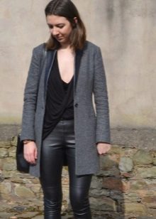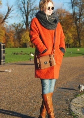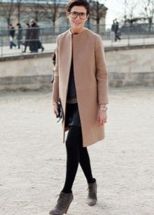 There are a number of clothes that can not be combined with a coat without a collar for any reason.This includes leggings, jeans, which have nothing to do with the classics (light, wide, flared, with scuffs), skirts with mini and maxi lengths, and boots.