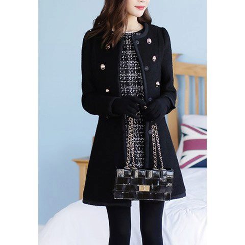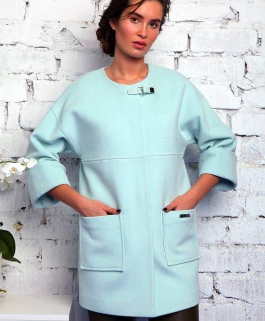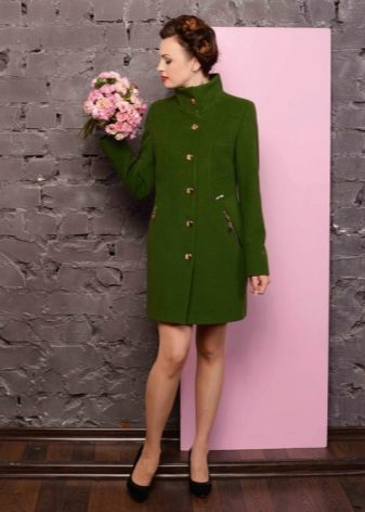 The most common model of a coat without a collar is straight cutin which the waist is distinguished with a belt.