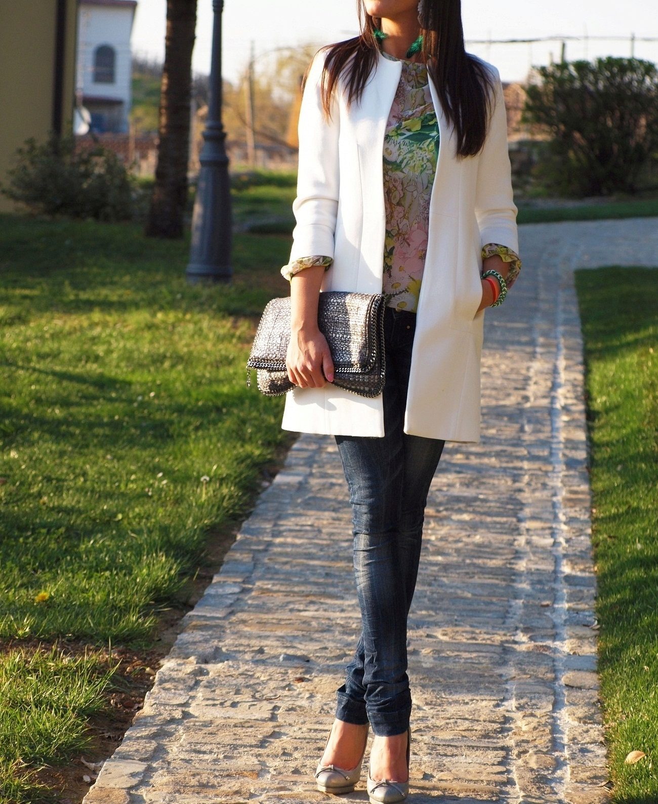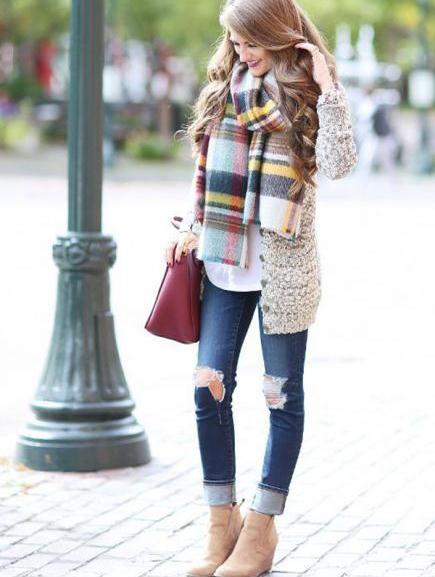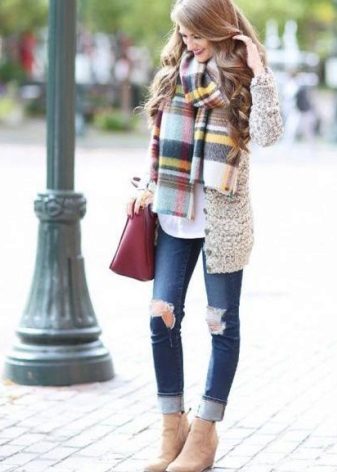 We said that you cannot wear torn jeans with a collarless coat, but for every piece of advice you can find exceptions, and the rules are given to us to break them. The creator of this image decided to take a chance and show her individuality, combine dark skinny jeans with sexy slits on the knees with a milk cashmere coat. She succeeded in this experiment, it should be noted. And how harmoniously looks colorful scarf, which is matched to the handbag.