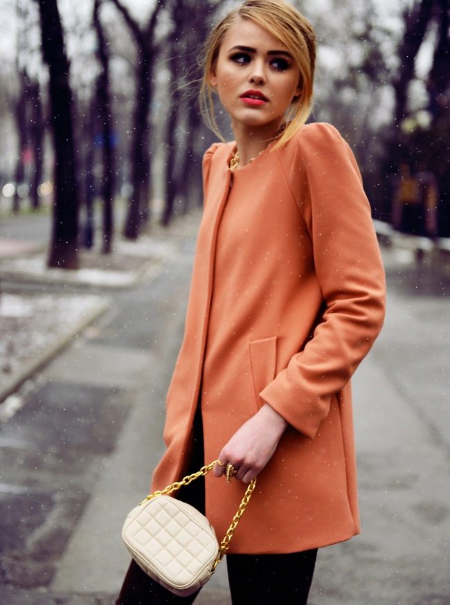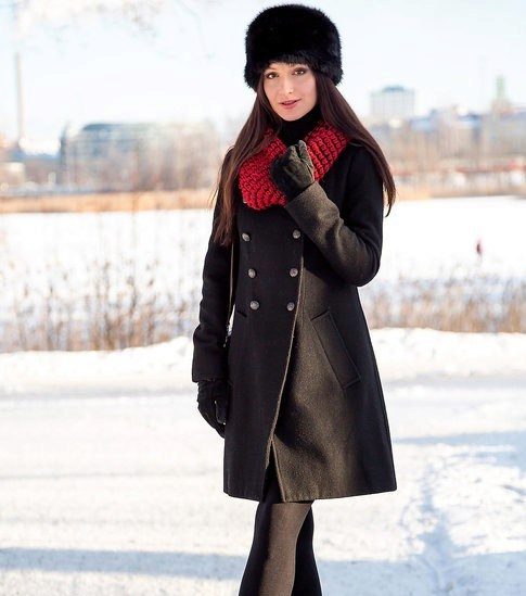 Moderately bright image created on the basis of a free cut coral coat. The wide scarf in a small black and white print echoes the black bag, gloves, goggles and high boots. Everything in this image is thought out to the smallest detail, because it seems harmonious, holistic and complete.