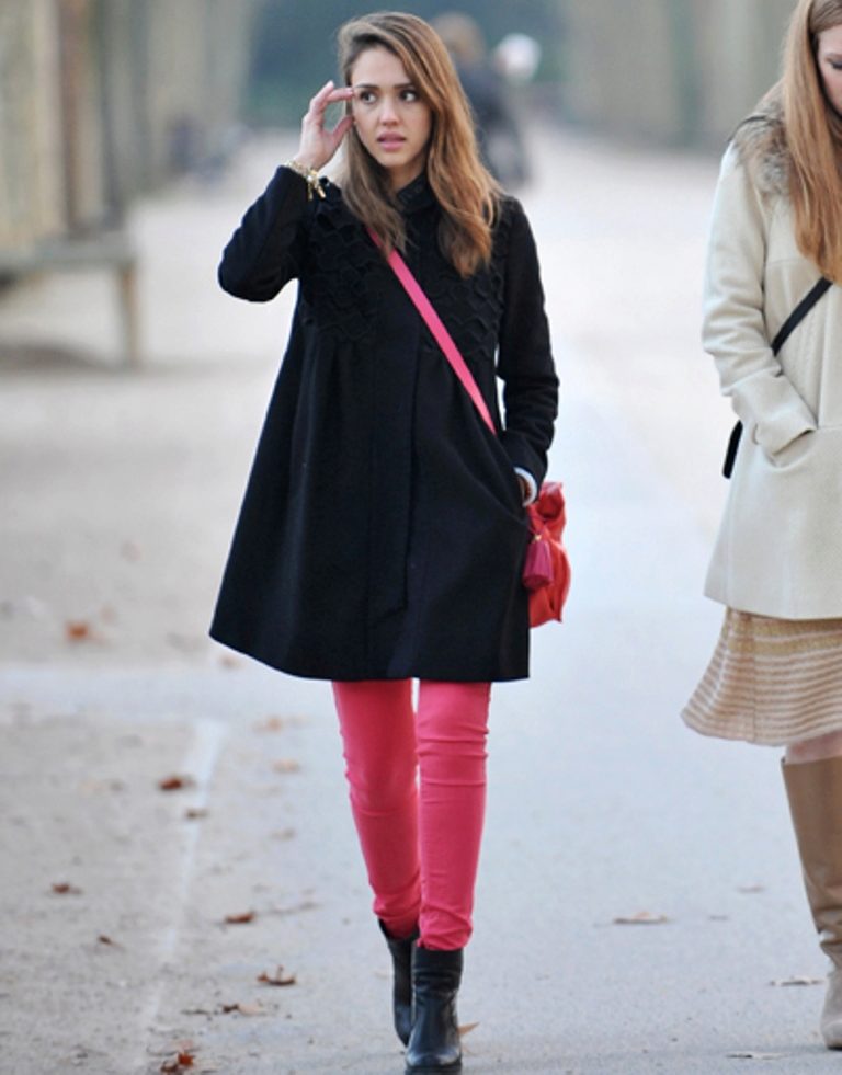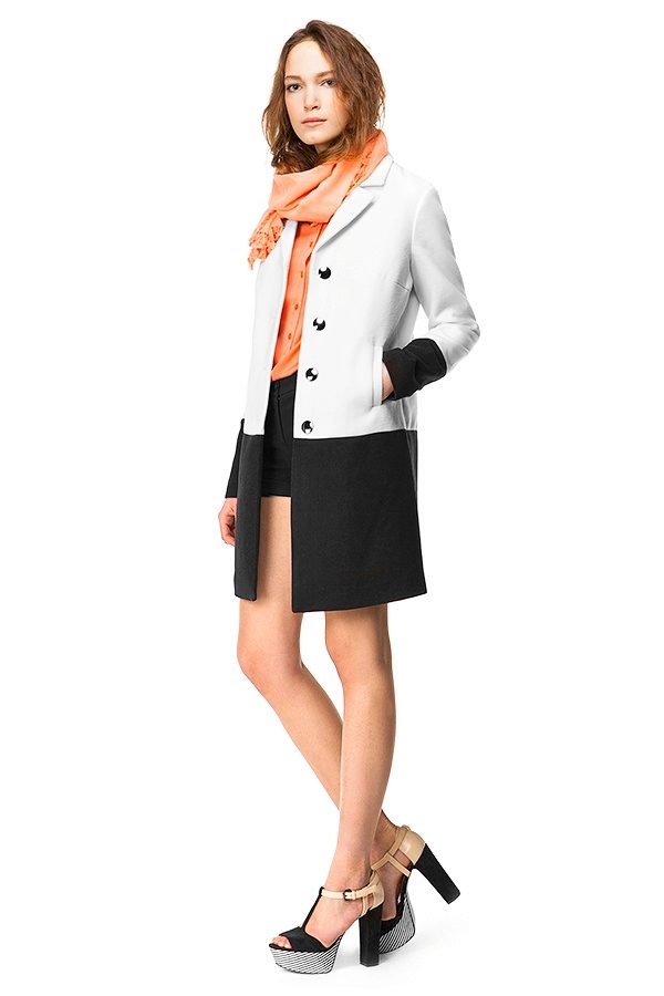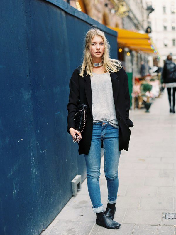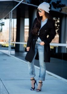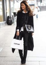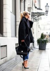- The classic combination of black and white, coat with cropped jeans. The top should be rather pale, and you can add colors with a bright bag.