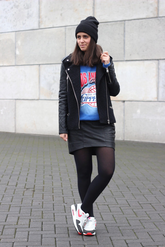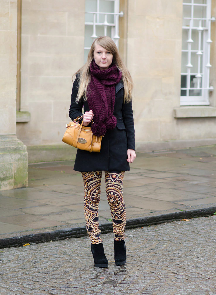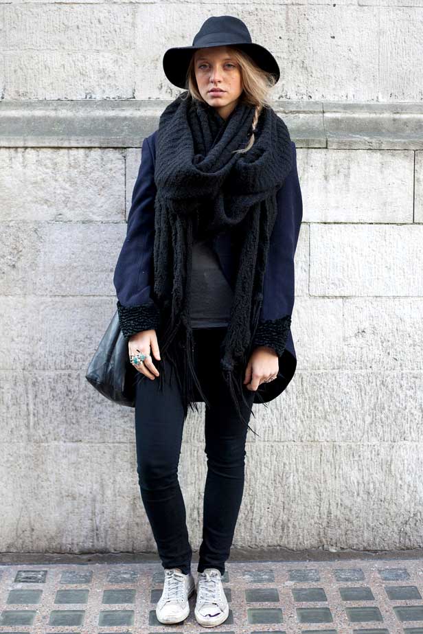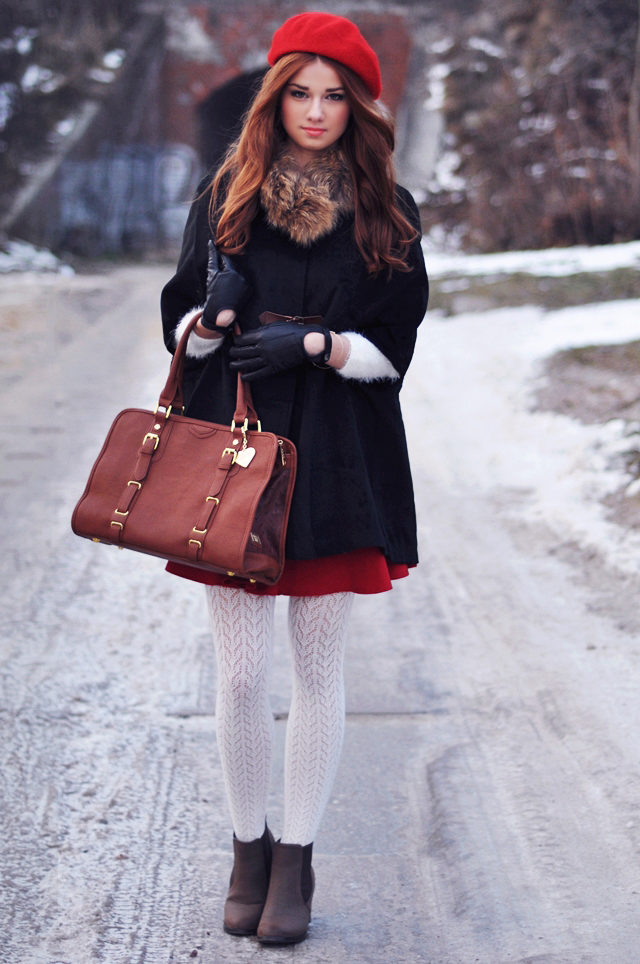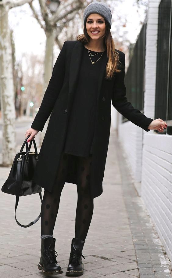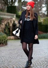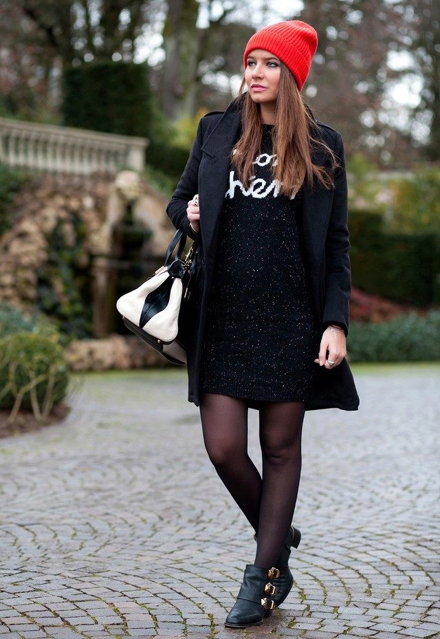 A short black dress under a coat, tights with an ornament, flat shoes and a knitted hat create a charming casual look.