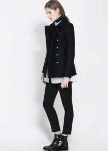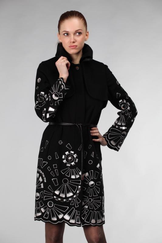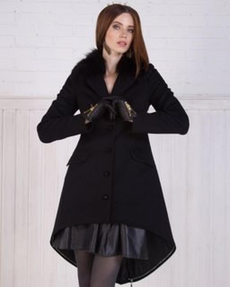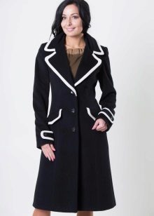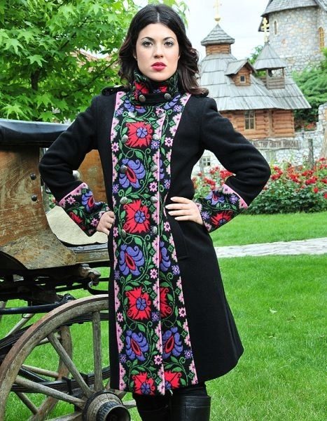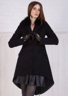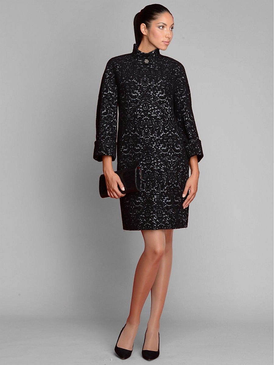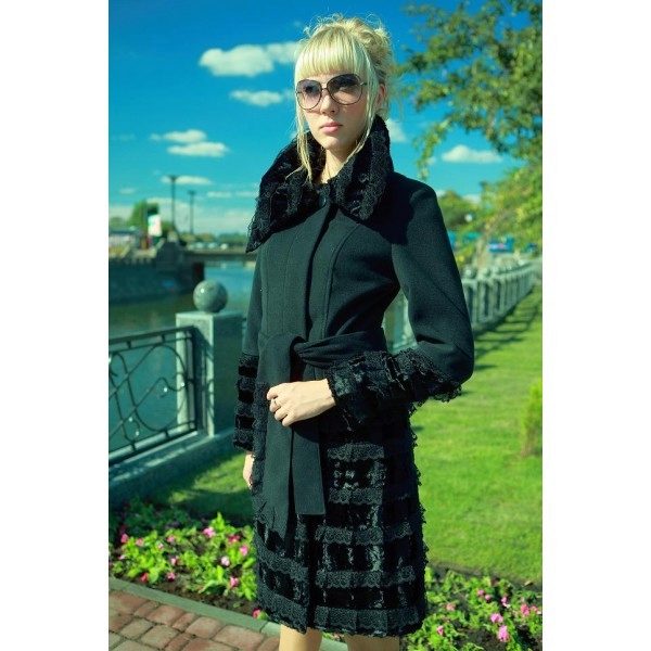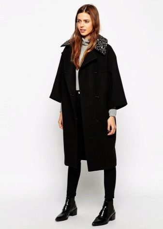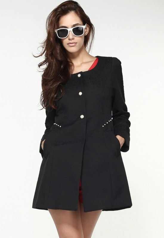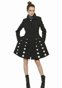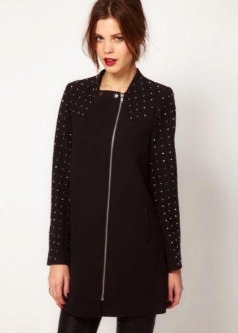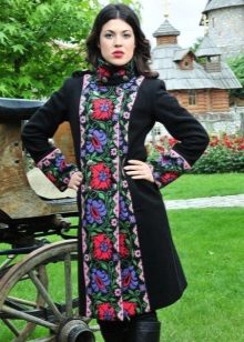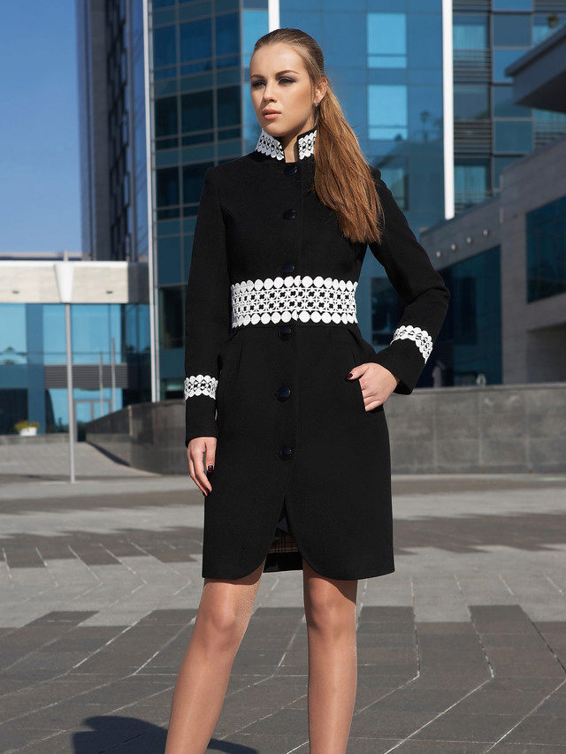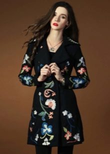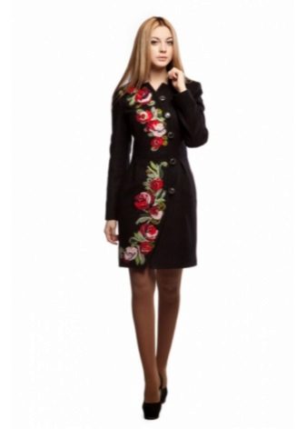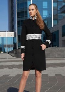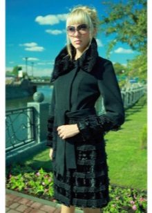 The black coat is a fairly classic strict version of outerwear, but there are many products with bright and attractive decor. Sewn to individual parts (lapels, cuffs, pockets) pebbles, beads, buttons, large rhinestones can become jewelry. Embroidery and appliqué allows you to lay out an interesting pattern or pattern. Inserts and sewn lace details are used.
